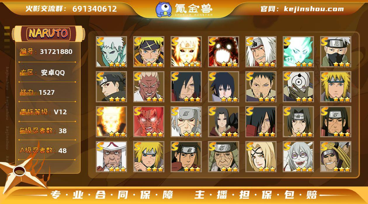 战力值(万):1527 S忍数:38 A忍数:48 金币:4351 点券:675 通灵兽数:20 忍者数:245 【超影】 【无】 【V12】 【可转生】 【可二次实名】 S级忍者38 S级忍者:十尾人柱力宇智波带土,漩涡鸣人·宇智波佐助,天道佩恩,秽土转生解宇智波斑,舞之豪杰自来也,九喇嘛连结波风水门,秽土转生波风水门,秽土转生猿飞日斩,须佐能乎宇智波鼬,仙人模式药师兜,忍界大战宇智波带土,木叶创立宇智波斑,九喇嘛连结漩涡鸣人,大蛇丸,波风水门(普通),传说中的三忍自来也,秽土转生千手扉间,秽土转生千手柱间,死门迈特凯,须佐能乎宇智波止水,须佐能乎旗木卡卡西,暴怒第六尾漩涡鸣人,秽土转生金角银角,秽土转生长门,千手柱间(普通),四代目雷影艾,仙人模式自来也,猿飞日斩(普通),纲手(普通),自来也(普通),秽土转生宇智波鼬,最终章大筒木舍人,忍界大战艾,百豪纲手,永恒万花筒宇智波佐助,秽土转生宇智波斑,白面具宇智波斑,二代目土影无;