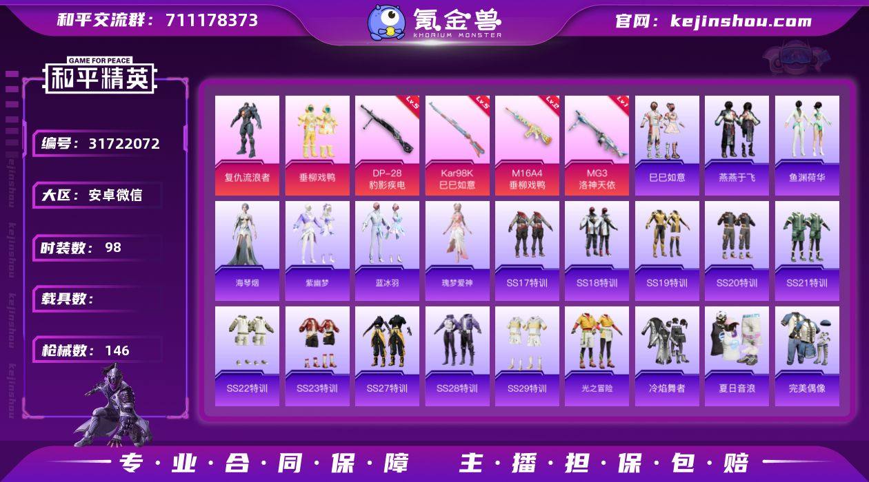 安卓 微信-2粉装-9特效枪-0载具-0粉色飞行器-40171热力值-9王牌印记-98套装-146枪皮 【粉色套装】:角色-复仇流浪者,粉装-垂柳戏鸭 【粉色枪皮等级】:M16A4-垂柳戏鸭(二级),AKS-74U-森灵之息(三级),Kar98K-巳巳如意(五级),DP-28-豹影疾电(五级),MG3-洛神天依(一级) 【粉色枪皮】:M16A4-垂柳戏鸭,AKS-74U-森灵之息,Kar98K-巳巳如意,Mk14-辉云木星,Mk14-福马献瑞,DP-28-豹影疾电,MG3-洛神天依 【粉色降落伞】:炙焰牛王降落伞,垂柳戏鸭降落伞,闲梦青缨降落伞,莲影清波降落伞 【稀有套装】:套装-巳巳如意,套装-燕燕于飞,套装-鱼渊荷华,角色-海琴烟,套装-紫幽梦,套装-蓝冰羽,角色-瑰梦爱神,套装-雨过天青,套装-红釉青花 【稀有枪皮】:AKM-灼热熔岩,AKM-破晓战魂,AKM-虎虎生威,AKM-龙的传人,M16A4-幻世战舞者,M16A4-甜心亚梦,SCAR-L-夜灯,SCAR-L-炫彩节奏,SCAR-L-玉兔迎春,SCAR-L-红色方程式,SCAR-L-冷漠罗丽,M416-糯团青竹,M416-红色方程式,M416-蓝色火焰,GROZA-彩虹符号,AUG-天降萌叽,AUG-耀粉歌者,QBZ-彩虹符号,QBZ-洛神天依,M762-天降萌叽,M762-彩虹符号,Mk47-洛神天依,G36C-星穹咏叹调,AC-VAL-天降萌叽,AC-VAL-彩虹甜喵,AC-VAL-甜心亚梦,AC-VAL-闲梦青缨,蜜獾-垂柳戏鸭,蜜獾-天降萌叽,蜜獾-娇憨猪猪,UZI-啾咪啾咪,UZI-天降萌叽,UZI-娇憨猪猪,UZI-炫彩节奏,UZI-红色方程式,UMP45-夜灯,UMP45-蓝色火焰,Vector-生命誓言,汤姆逊-天降萌叽,汤姆逊-耀粉歌者,汤姆逊-智耀战神,AKS-74U-鬼刀,P90-巳巳如意,Kar98K-炫彩节奏,Kar98K-红色方程式,M24-炫彩节奏,AWM-垂柳戏鸭,SKS-炫彩节奏,Mini14-耀粉歌者,SLR-娇憨猪猪,M417-惊鸿侠骨,M417-猪猪侠,M200-惊鸿侠骨,S686-奇异狩猎者,S686-生命誓言,S686-红色方程式,S686-巳巳如意,S1897-炫彩...