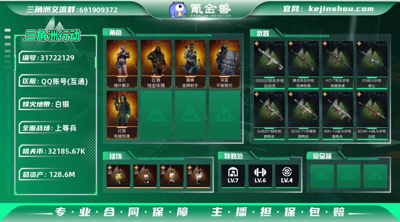 实名:可二次实名 总资产:128.6M 哈夫币:32185.67K 烽火地带段位:白银 烽火地带等级:60 全面战场段位:上等兵 全面战场等级:29 7级仓库,6级训练中心,4级靶场,5级指挥中心,1级潜水中心,3级防具台,3级工作台,3级制药台,3级技术中心,1级收藏室 战术部门等级:2 战斗部门等级:2 医疗部门等级:2 研发部门等级:1 后勤部门等级:1 曼德尔砖-气象感应:0 曼德尔砖-命运王牌:0 曼德尔砖-电玩高手:0 曼德尔砖-美杜莎:0