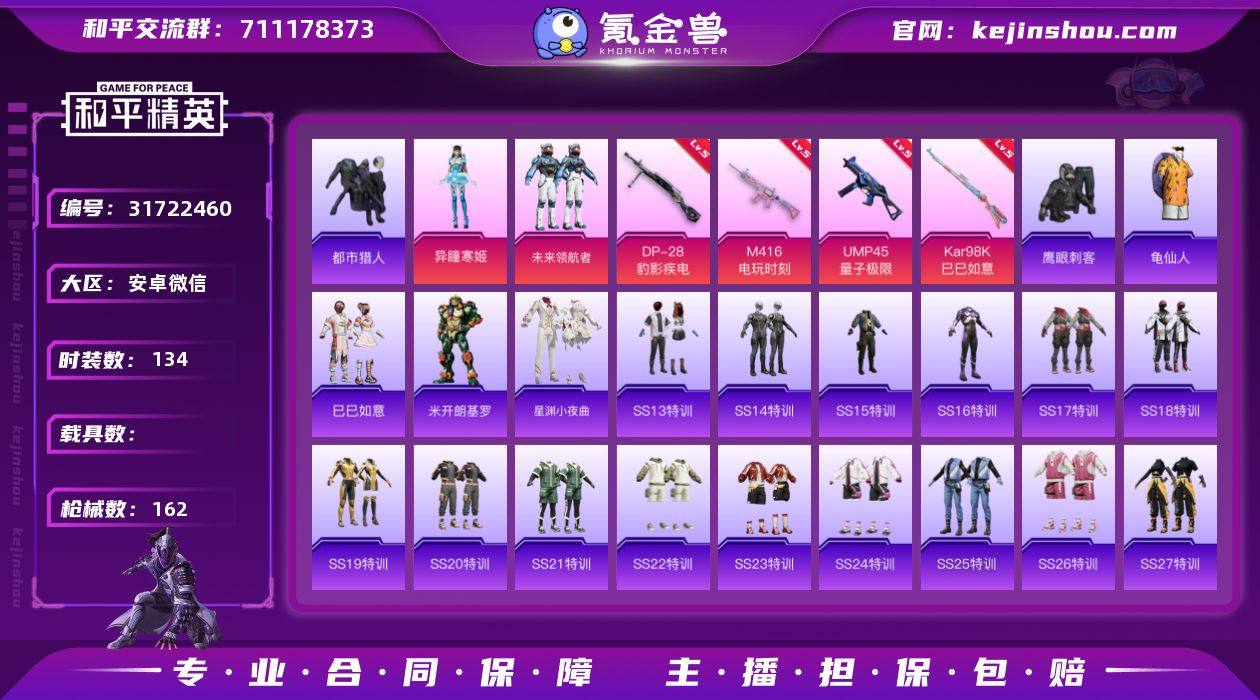 安卓 微信-2粉装-4特效枪-0载具-0粉色飞行器-48431热力值-9王牌印记-134套装-162枪皮 【热门品类】:套装-都市猎人,套装-龟仙人 【粉色套装】:粉装-未来领航者,角色-异瞳寒姬 【粉色枪皮等级】:M416-电玩时刻(五级),UMP45-量子极限(五级),Kar98K-巳巳如意(五级),DP-28-豹影疾电(五级) 【粉色枪皮】:M416-电玩时刻,UMP45-量子极限,Kar98K-巳巳如意,DP-28-豹影疾电 【粉色降落伞】:碧影闪光降落伞,垂柳戏鸭降落伞,忍者神龟降落伞,月影灵韵降落伞 【稀有套装】:套装-龟仙人,套装-巳巳如意,角色-米开朗基罗,套装-星渊小夜曲 【稀有枪皮】:AKM-彩虹符号,AKM-环太平洋,AKM-破晓战魂,AKM-龙的传人,M16A4-幻世战舞者,M16A4-甜心亚梦,M16A4-红色方程式,M16A4-蓝色火焰,SCAR-L-夜灯,SCAR-L-炫彩节奏,SCAR-L-玉兔迎春,SCAR-L-红色方程式,SCAR-L-小狗蛇点点,M416-糯团青竹,M416-红色方程式,M416-绯红前夜,M416-蓝色火焰,GROZA-异彩先驱,GROZA-影袭,GROZA-田园牧歌,AUG-天降萌叽,AUG-耀粉歌者,AUG-闲梦青缨,QBZ-飞驰魅影,M762-天降萌叽,M762-牛气冲天,M762-绯红前夜,Mk47-妙红点点,G36C-桃粉嫣然,AC-VAL-天降萌叽,AC-VAL-甜心亚梦,蜜獾-天降萌叽,蜜獾-娇憨猪猪,UZI-啾咪啾咪,UZI-天降萌叽,UZI-娇憨猪猪,UZI-影袭,UZI-炫彩节奏,UZI-红色方程式,UZI-月影灵韵,UMP45-夜灯,UMP45-涂山之恋,UMP45-生命誓言,UMP45-蓝色火焰,Vector-生命誓言,Vector-田园牧歌,Vector-魅影蝠王,汤姆逊-天降萌叽,汤姆逊-异彩先驱,汤姆逊-耀粉歌者,MP5K-异彩先驱,P90-飞驰魅影,P90-巳巳如意,Kar98K-彩虹符号,Kar98K-影袭,Kar98K-炫彩节奏,Kar98K-红色方程式,Kar98K-飞驰魅影,M24-影袭,M24-炫彩节奏,M24-奇异狩猎者,AWM-恐龙拽拽,SKS-糯团青竹,VSS-彩虹符号,VSS-田园...