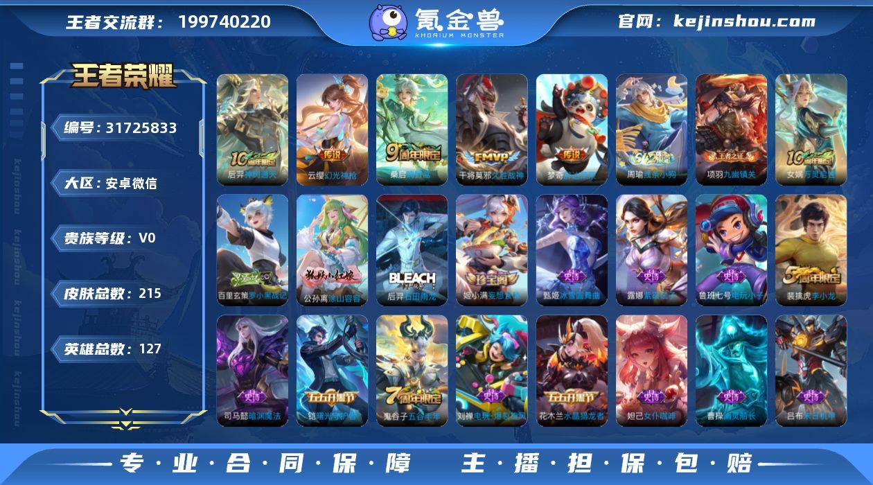 贵族等级:V0 典藏皮肤数:0 珍品无双皮肤数:0 无双皮肤数:0 珍品传说皮肤数:0 传说皮肤数:5 史诗皮肤数:54 皮肤数:215 英雄数:127 段位:星耀 卖家说:看上的带价,可以低市场价10%出,帐号有一个荣耀水晶,