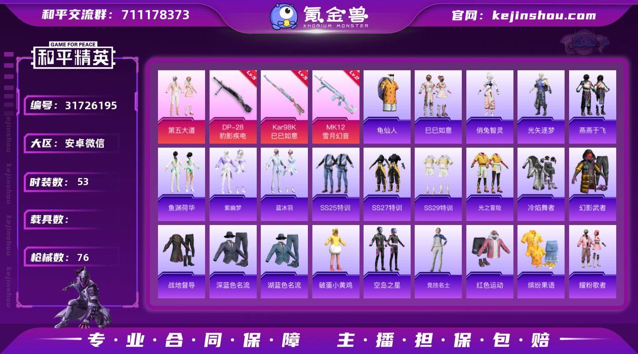 安卓 微信-1粉装-3特效枪-0载具-0粉色飞行器-20921热力值-8王牌印记-53套装-76枪皮 【热门品类】:套装-龟仙人 【粉色套装】:粉装-第五大道 【粉色枪皮等级】:汤姆逊-星月云朵(二级MK12-雪月幻音),Kar98K-巳巳如意(五级),DP-28-豹影疾电(五级) 【粉色枪皮】:Kar98K-巳巳如意,MK12-雪月幻音,DP-28-豹影疾电 【粉色降落伞】:未来领航者降落伞,月影灵韵降落伞,绯穹魔姬降落伞 【稀有套装】:套装-龟仙人,套装-巳巳如意,角色-俏兔智灵,角色-光矢逐梦,套装-燕燕于飞,套装-鱼渊荷华,套装-紫幽梦,套装-蓝冰羽 【稀有枪皮】:AKM-龙的传人,M16A4-红色方程式,SCAR-L-炫彩节奏,SCAR-L-红色方程式,SCAR-L-净心行者,M416-糯团青竹,M416-蓝色火焰,AUG-耀粉歌者,AUG-月影灵韵,M762-天降萌叽,M762-彩虹符号,蜜獾-天降萌叽,UZI-红色方程式,UMP45-炫光之旅,UMP45-生命誓言,UMP45-蓝色火焰,汤姆逊-天降萌叽,汤姆逊-炫彩节奏,汤姆逊-耀粉歌者,Kar98K-红色方程式,Mini14-炫彩节奏,Mini14-耀粉歌者,S686-红色方程式,S12K-玩趣呆呆,DBS-彩虹符号,DBS-幻彩电音,DBS-月影灵韵,M249-破晓战魂,MG3-幻世战舞者 【其他套装】:套装-SS25特训,套装-SS27特训,套装-SS29特训,套装-光之冒险,套装-冷焰舞者,套装-幻影武者,套装-战地督导,套装-深蓝色名流,套装-湖蓝色名流,套装-破蛋小黄鸡,套装-空岛之星,套装-竞技名士,套装-红色运动,套装-缤纷果语,套装-耀粉歌者,套装-蓝彩潮人,套装-长空猛禽,套装-雨林探路者,套装-霓虹街区,套装-黄色名流,套装-龙的传人,套装-龟仙人,套装-沙漠毒蛇,套装-极地朋克,套装-冰川特警,套装-香榭午后 【营地ID】:958063677