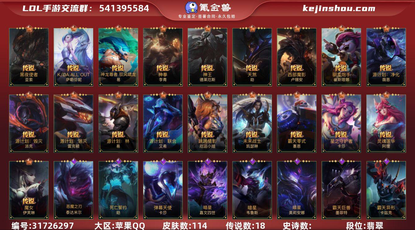 MLL1457【1神话 18传说】苹果Q-英雄112-114皮肤-段位:翡翠【神话】流光仙韵莫甘娜【传说】星之守护者卡莎 源计划泯灭雷克顿 未来战士凯特琳 神拳李青 神龙尊者驭风啸龙易 神王德莱厄斯 天煞劫 源计划:联合艾希 霸天零式赛恩 K/DA ALLOUT萨勒芬妮 源计划:净化薇恩 黑夜使者亚索 灵魂莲华阿狸 源计划:毁灭派克 跳跳倩影厄运小姐 驯龙炮手崔丝塔娜 魔女伊芙琳 西部魔影卢锡安【皮肤】黑夜使者亚索 K/DA ALLOUT萨勒芬妮 神龙尊者 驭风啸龙 神拳盲僧 神王德莱厄斯 天煞劫 西部魔影卢锡安 魔女伊芙琳 驯龙炮手 源计划:泯灭 跳跳倩影女枪 未来战士女警 霸天零式塞恩 星之守护者卡莎 灵魂莲华阿狸 死亡誓约劫 清剿小队金克丝 秘旅探索者加里奥 弹幕天使 战场之王亚索 圣诞老人 神龙尊者 玉境灵龙 泳池派对盲僧 泳池派对剑姬 玉剑传说 武剑仙 星之守护者EZ 霸天剑魔亚托克斯 探梦奇旅艾克 心之钢永恩 腥红之月希维尔 太空律动努努 雷喵喵尔 光明哨兵锐雯 K/DA ALL OUT卡莎 猎龙勇士潘森 灵魂烈焰 梦境灵探赛娜 晨星之翎 暗星皇子 暗星发条 暗星维鲁斯 霸天巨兽石头人 霸天异形螳螂 霸天战士狮子狗 冰川巨兽石头人 冰封王子 恶魔之刃 死亡誓约卡特 天启骑士 s1光耀之刃 s4光耀之心 s5绯金魅影 s6绯金丽刃 s7绯金战斧 s8绯金鮫灵 s9王牌舰长