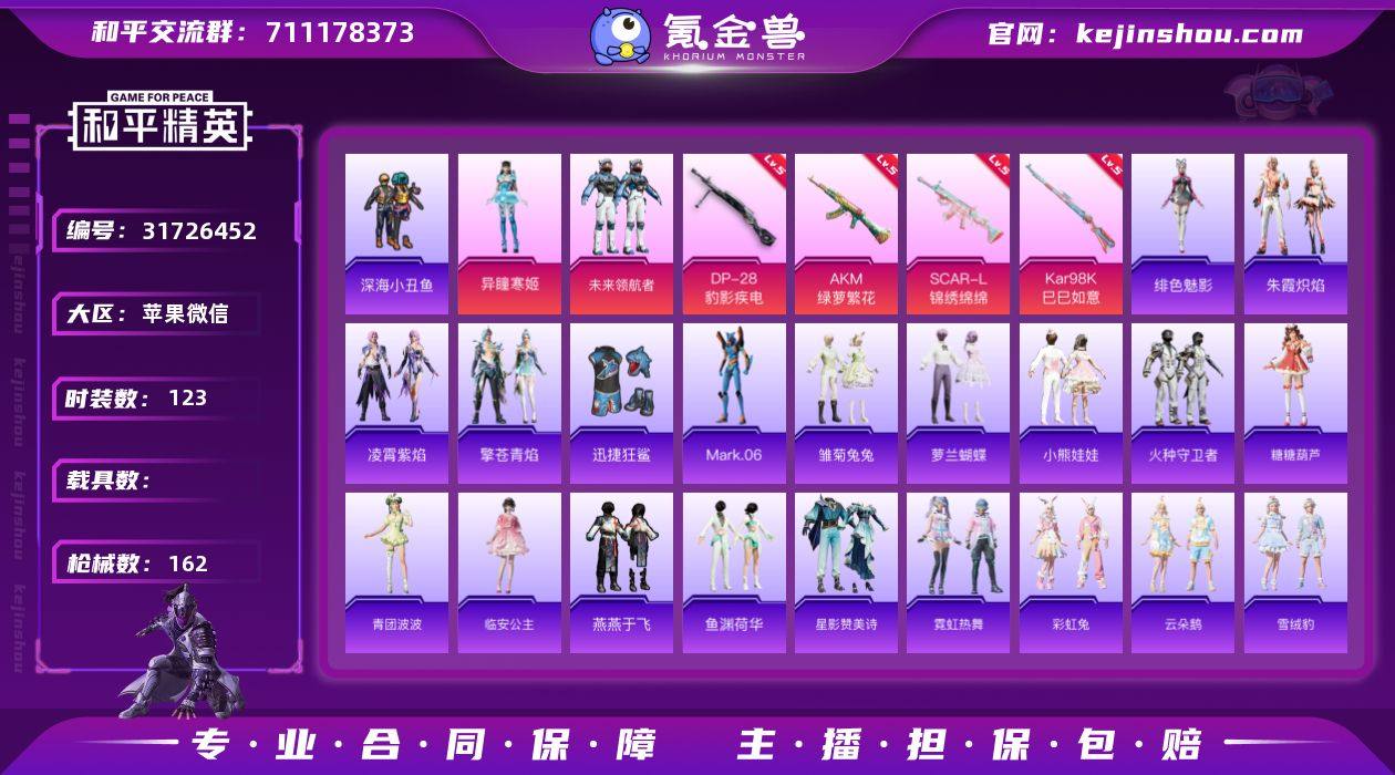 苹果 微信-3粉装-4特效枪-0载具-0粉色飞行器-44099热力值-13王牌印记-123套装-162枪皮 【热门品类】:套装-深海小丑鱼,角色-Mark.06 【粉色套装】:粉装-未来领航者,角色-异瞳寒姬 【粉色枪皮等级】:AKM-绿萝繁花(五级),SCAR-L-锦绣绵绵(五级),Kar98K-巳巳如意(五级),DP-28-豹影疾电(五级) 【粉色枪皮】:AKM-绿萝繁花,SCAR-L-锦绣绵绵,Kar98K-巳巳如意,DP-28-豹影疾电 【粉色降落伞】:垂柳戏鸭降落伞,鬼刀降落伞,幻彩电音降落伞,喜羊羊与灰太狼降落伞 【稀有套装】:套装-雏菊兔兔,套装-萝兰蝴蝶,套装-小熊娃娃,套装-火种守卫者,套装-糖糖葫芦,套装-青团波波,角色-临安公主,套装-燕燕于飞,套装-鱼渊荷华,套装-星影赞美诗,套装-霓虹热舞,套装-彩虹兔,套装-云朵鹅,套装-雪绒豹,角色-夜瞳黯灵,套装-朱霞炽焰,套装-凌霄紫焰,套装-擎苍青焰,角色-绯色魅影 【稀有枪皮】:AKM-破晓战魂,AKM-龙的传人,M16A4-幻世战舞者,SCAR-L-夜灯,SCAR-L-炫彩节奏,SCAR-L-玉兔迎春,M416-摩登王国,M416-糯团青竹,M416-红色方程式,M416-蓝色火焰,GROZA-影袭,AUG-耀粉歌者,QBZ-绒兔团圆,M762-天降萌叽,M762-奇异狩猎者,M762-彩虹符号,M762-云朵鹅,G36C-炙焰牛王,AC-VAL-天降萌叽,AC-VAL-快闪甜心,蜜獾-天降萌叽,ARX-凌霄紫焰,UZI-啾咪啾咪,UZI-天降萌叽,UZI-影袭,UZI-红色方程式,UZI-月影灵韵,UMP45-繁龙极客,UMP45-夜灯,UMP45-蓝色火焰,Vector-焰鹰斗篷,Vector-生命誓言,汤姆逊-天降萌叽,汤姆逊-耀粉歌者,JS9-凌霄紫焰,P90-快闪甜心,P90-巳巳如意,Kar98K-彩虹符号,Kar98K-红色方程式,Kar98K-星穹咏叹调,M24-影袭,AWM-焰鹰斗篷,VSS-彩虹符号,Mini14-穿刺龙虾,Mini14-耀粉歌者,AMR-喜羊羊与灰太狼,M417-惊鸿侠骨,MK20-H-快闪甜心,M200-惊鸿侠骨,SVD-云朵...