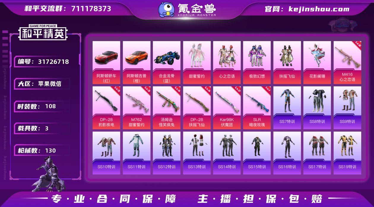 苹果 微信-5粉装-7特效枪-3载具-4粉色飞行器-47324热力值-2王牌印记-108套装-130枪皮 【粉色套装】:粉装-甜蜜誓约,粉装-心之恋语,粉装-极致幻想,粉装-扶摇飞仙,粉装-花影阑珊 【粉色枪皮等级】:M416-心之恋语(六级),M762-甜蜜誓约(五级),汤姆逊-怪笑疯兔(四级),Kar98K-伏魔团(二级),SLR-暗夜玫瑰(一级),DP-28-扶摇飞仙(四级),DP-28-豹影疾电(五级) 【粉色载具】:阿斯顿马丁DBS(红),阿斯顿马丁DBX(橙),合金龙骨(蓝),空客H135-蔚蓝之翼 【粉色枪皮】:M416-心之恋语,M762-甜蜜誓约,汤姆逊-怪笑疯兔,Kar98K-伏魔团,SLR-暗夜玫瑰,DP-28-扶摇飞仙,DP-28-豹影疾电 【粉色飞行器】:伏魔团飞行器,甜蜜誓约飞行器,心之恋语飞行翼,扶摇飞仙飞行器 【粉色降落伞】:甜蜜誓约降落伞,四圣焕新降落伞,心之恋语降落伞,扶摇飞仙降落伞,机甲封神降落伞,炫光之旅降落伞,樱桃泡泡降落伞,幻彩电音降落伞 【稀有枪皮】:AKM-冰凉西瓜,AKM-夜灯,AKM-生命誓言,AKM-破晓战魂,AKM-萌趣颜团子,AKM-虎虎生威,SCAR-L-扶摇飞仙,SCAR-L-炫彩节奏,SCAR-L-玉兔迎春,SCAR-L-甜蜜誓约,GROZA-治愈之星,GROZA-黑色刀锋,AUG-青春冒险家,QBZ-原初圣火,QBZ-彩虹符号,M762-牛气冲天,M762-瑞龙福将,Mk47-青春冒险家,G36C-时空追击者,AC-VAL-天降萌叽,蜜獾-娇憨猪猪,UZI-众神之王,UZI-天降萌叽,UZI-娇憨猪猪,UZI-炫彩节奏,UZI-烈焰拳霸,UMP45-时空追击者,UMP45-生命誓言,Vector-夜灯,Vector-彩虹符号,Vector-治愈之星,Vector-生命誓言,汤姆逊-天降萌叽,汤姆逊-异彩先驱,汤姆逊-银刃赛罗,野牛-夜灯,野牛-扶摇飞仙,野牛-青春冒险家,MP5K-众神之王,MP5K-甜蜜誓约,Kar98K-彩虹符号,M24-治愈之星,M24-众神之王,SKS-心之恋语,SKS-时空追击者,SKS-炫彩节奏,Mini14-原初圣火,...