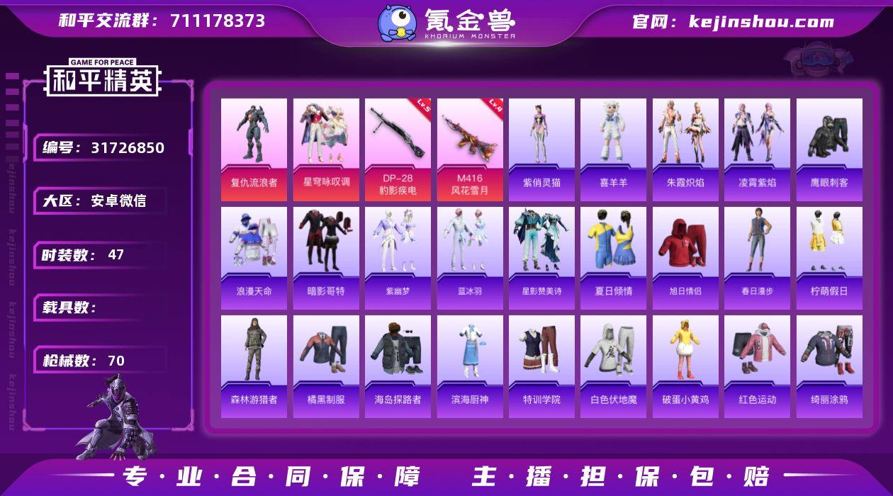 安卓 微信-2粉装-2特效枪-0载具-0粉色飞行器-16529热力值-1王牌印记-47套装-70枪皮 【热门品类】:套装-浪漫天命,套装-暗影哥特 【粉色套装】:角色-复仇流浪者,粉装-星穹咏叹调 【粉色枪皮等级】:M416-风花雪月(四级),DP-28-豹影疾电(五级) 【粉色枪皮】:M416-风花雪月,DP-28-豹影疾电 【粉色降落伞】:星穹咏叹调降落伞,喜羊羊与灰太狼降落伞,异瞳寒姬降落伞,炫彩糖果降落伞 【稀有套装】:套装-紫幽梦,套装-蓝冰羽,套装-星影赞美诗,套装-朱霞炽焰,套装-凌霄紫焰,玩偶服-喜羊羊,角色-紫俏灵猫 【稀有枪皮】:SCAR-L-夜灯,GROZA-影袭,AUG-耀粉歌者,M762-奇异狩猎者,Mk47-洛神天依,ARX-凌霄紫焰,UZI-影袭,Vector-生命誓言,汤姆逊-天降萌叽,JS9-凌霄紫焰,Kar98K-影袭,Kar98K-星穹咏叹调,M24-影袭,SKS-炫彩节奏,AMR-喜羊羊与灰太狼,S12K-智耀战神,DBS-幻彩电音,MG-36-凌霄紫焰,P92-凌霄紫焰,爆炸猎弓-喜羊羊与灰太狼,平底锅-凌霄紫焰 【其他套装】:套装-夏日倾情,套装-旭日情侣,套装-春日漫步,套装-暗影哥特,套装-柠萌假日,套装-森林游猎者,套装-橘黑制服,套装-浪漫天命,套装-海岛探路者,套装-滨海厨神,套装-特训学院,套装-白色伏地魔,套装-破蛋小黄鸡,套装-红色运动,套装-绮丽涂鸦,套装-绯格组合,套装-蓝彩潮人,套装-蓝色运动,套装-街头潮人,套装-都市魅力,套装-顽皮玉兔,套装-魅力单车,套装-黄色运动,套装-黑色伏地魔,套装-鹰眼刺客,套装-冰冻风暴,套装-漫步者,套装-天籁歌者 【营地ID】:1025687014