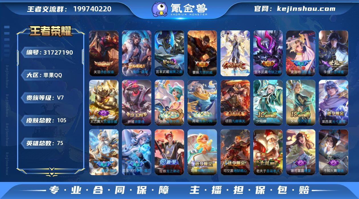 贵族等级:V7 典藏皮肤数:1 珍品无双皮肤数:0 无双皮肤数:0 珍品传说皮肤数:1 传说皮肤数:5 史诗皮肤数:32 皮肤数:105 英雄数:75 段位:绝世王者 卖家说:1.5w司空震1.2w老夫子 圣诞老人