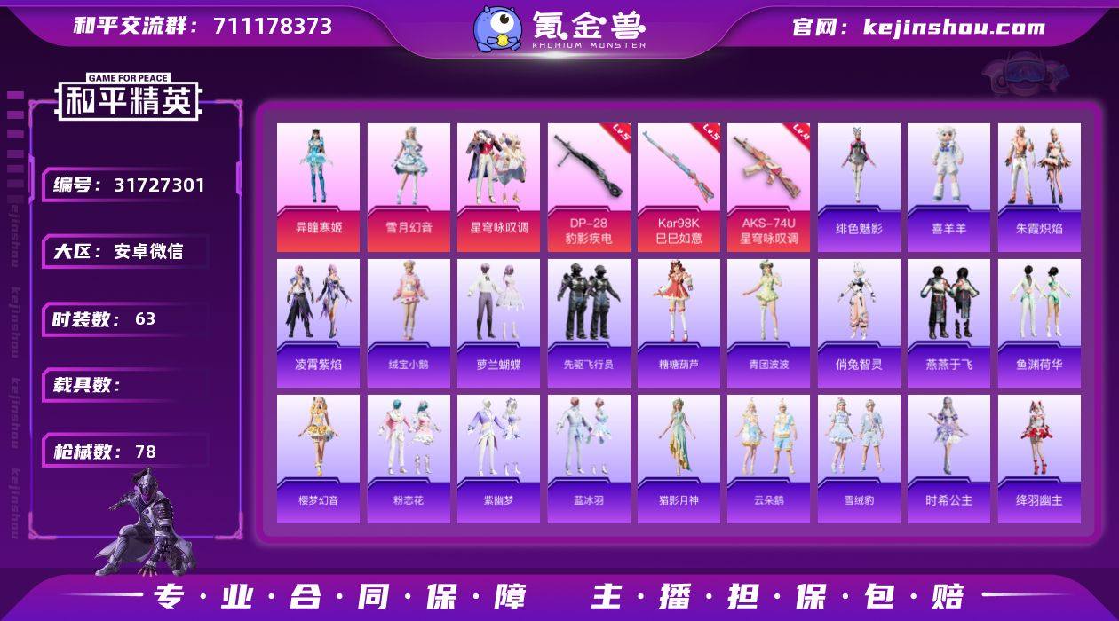 安卓 微信-3粉装-3特效枪-0载具-0粉色飞行器-25755热力值-1王牌印记-63套装-78枪皮 【粉色套装】:粉装-雪月幻音,粉装-星穹咏叹调,角色-异瞳寒姬 【粉色枪皮等级】:AKS-74U-星穹咏叹调(四级),Kar98K-巳巳如意(五级),DP-28-豹影疾电(五级) 【粉色枪皮】:AKS-74U-星穹咏叹调,Kar98K-巳巳如意,DP-28-豹影疾电 【粉色降落伞】:第五大道降落伞,时空协奏降落伞,英伦信使降落伞,精灵之光降落伞,千金淑猫降落伞,桃粉嫣然降落伞,星月云朵降落伞,星穹咏叹调降落伞,喜羊羊与灰太狼降落伞,异瞳寒姬降落伞 【稀有套装】:套装-绒宝小鹅,套装-萝兰蝴蝶,套装-先驱飞行员,套装-糖糖葫芦,套装-青团波波,角色-俏兔智灵,套装-燕燕于飞,套装-鱼渊荷华,套装-樱梦幻音,套装-粉恋花,套装-紫幽梦,套装-蓝冰羽,角色-猎影月神,套装-云朵鹅,套装-雪绒豹,角色-时希公主,角色-绛羽幽主,套装-朱霞炽焰,套装-凌霄紫焰,玩偶服-喜羊羊,角色-绯色魅影 【稀有枪皮】:AKM-星月云朵,GROZA-荧海星豚,M762-云朵鹅,G36C-星穹咏叹调,AC-VAL-闲梦青缨,蜜獾-天降萌叽,ARX-凌霄紫焰,UMP45-绒宝小鹅,Vector-焰鹰斗篷,JS9-凌霄紫焰,Kar98K-星穹咏叹调,M24-幻彩电音,AWM-焰鹰斗篷,SKS-炫彩节奏,AMR-喜羊羊与灰太狼,SVD-云朵鹅,DBS-焰鹰斗篷,SPAS-12-云朵鹅,DP-28-焰鹰斗篷,DP-28-彩虹符号,MG-36-凌霄紫焰,P92-凌霄紫焰,短管霰弹-星穹咏叹调,沙漠之鹰-云朵鹅,TMP-9-江南烟雨,爆炸猎弓-喜羊羊与灰太狼,大砍刀-云朵鹅,平底锅-凌霄紫焰 【其他套装】:套装-幻影武者,套装-柠萌假日,套装-热血青春,套装-猎鹰,套装-白色伏地魔,套装-破蛋小黄鸡,套装-竞技名士,套装-竞技达人朋克,套装-红色运动,套装-绯格组合,套装-耀粉歌者,套装-蓝彩潮人,套装-都市魅力,套装-青年教官,套装-魅力单车,...