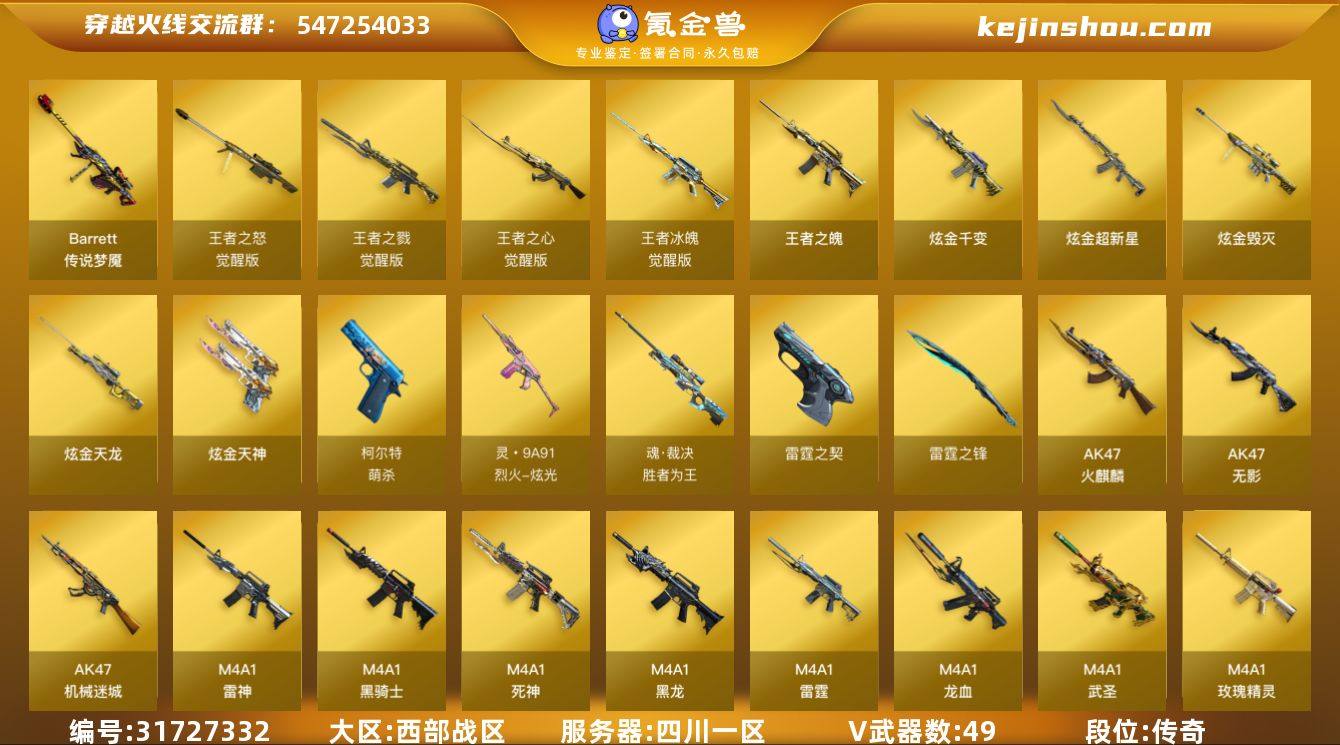 V武器: M4A1-黑骑士,COP雷霆,M4A1-死神,M4A1-雷神,Kar98k-星神,屠龙,龙啸,AWM-天龙,AK12-天启,Barrett-极光,RPK-盘龙,9A91-烈火,麒麟刺,M4A1-黑龙,M4A1-玫瑰精灵,擎天,M4A1-雷霆,盘龙,Barrett-毁灭,QBZ03-金色蔷薇,M4A1-武圣,AK47-机械迷城 王者武器: 王者之魄,王者之心,王者冰魄,王者之戮 传说武器: 传说梦魇 炫金武器: 炫金千变,炫金超新星 英雄角色: 零,炫,葵 王者角色: 王者葵-惊若翩鸿 音效道具: AK47-火麒麟音效卡,M4A1-黑骑士音效卡,Barrett-毁灭音效卡,M4A1-雷神音效卡 亮点: 缩略图 [7196116]3734/西部/四川一区/可排位/未定级/80v/【1传说】/传说梦魇/星神/QBZ金色蔷薇/M4雷霆套/龙血/武圣精灵/烈火/盘龙/炼狱/COP雷霆/【音效卡】/绝迹语音包/雷神音效卡/黑骑士音效卡/火麒麟音效卡/毁灭音效卡/【皮肤】/死神机甲核心/毁灭星空/火麒麟心动糖果/火麒麟平安大圣/荣耀之锋/【2个四防角色】/王者葵惊若翩鸿/职业选手/6套雷/