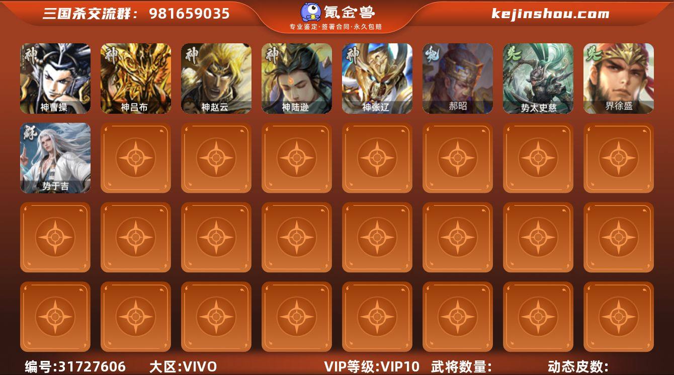 官阶:大将军;VIP等级:VIP9;史诗武将数量:36;动态皮肤数量:20;武将总数:382;史诗宝珠数量:0;将魂数量:274;神将:7;魏国史诗武将:12;蜀国史诗武将:11;吴国史诗武将:5;群史诗武将:8 神赵云,神陆逊,神张辽,神太史慈,神吕蒙,神周瑜,神诸葛亮,王粲,杨修,王凌,界钟会,界曹真,嵇康,曹纯,戏志才,刘晔,关索,马云騄,谋孙尚香,谋赵云,谋马超,诸葛瞻,王平,谯周,花鬘,董允,骆统,留赞,界朱然,界徐盛,贺齐,左慈,徐荣,麹义,沮授,公孙康,张绣,李傕,许攸,神陆逊-绽焰摧枯(动态),神周瑜-焰腾麒麟(动态),SP蔡文姬-兔年冬日(动态),荀彧-驱虎吞狼(动态),邓艾-神兵天降(动态),界邓艾-神兵天降(动态),曹真-虎年春节(动态),曹纯-虎年春节(动态),羊徽瑜-牛年中秋(动态),刘备-明良千古(动态),马超-牛年春节(动态),赵云-截江救主(动态),黄月英-鼠年春节(动态),黄月英-虎年中秋(动态),黄月英-木牛流马(动态),诸葛亮-明良千古(动态),界刘备-明良千古(动态),界赵云-截江救主(动态),界马超-牛年春节(动态),界诸葛亮-明良千古(动态),界黄月英-鼠年春节(动态),界黄月英-木牛流马(动态),夏侯氏-明良千古(动态),鲍三娘-虎年七夕(动态),孙鲁班-牛年端午(动态),刘赞-灵魂歌王(动态),貂蝉-鼠年七夕(动态),张角-迅雷风烈(动态),许攸-盛气凌人(动态),界貂蝉-鼠年七夕(动态),界张角-迅雷风烈(动态),SP貂蝉-驭魂千机(动态),刘协-龙困于渊(动态)