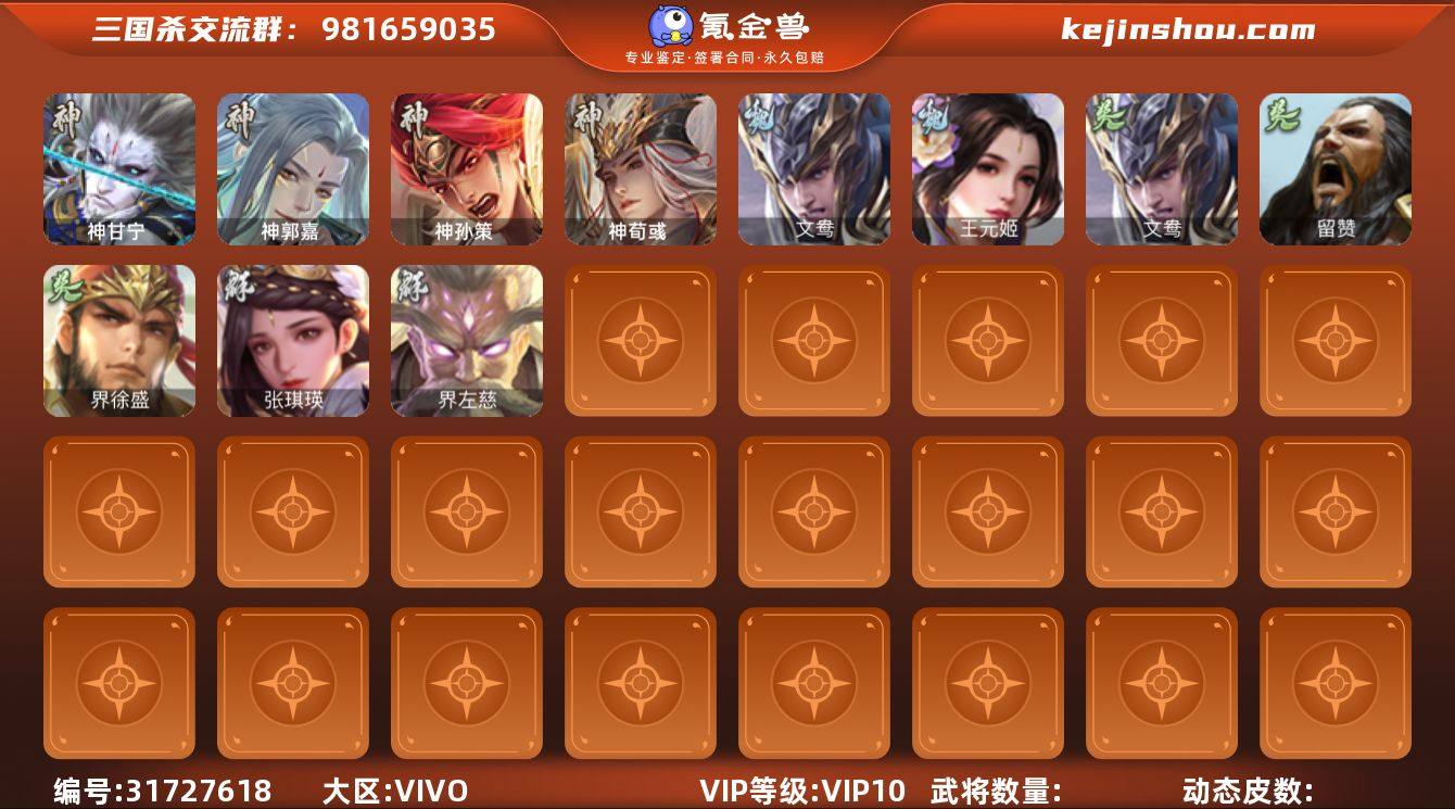 【3249】官阶:大将军;VIP等级:VIP11;史诗武将数量:57;动态皮肤数量:28;武将总数:419;史诗宝珠数量:20;将魂数量:2792;神将:8;魏国史诗武将:22;蜀国史诗武将:12;吴国史诗武将:7;群史诗武将:18 神吕布,神赵云,神陆逊,神甘宁,神张辽,神郭嘉,神太史慈,神诸葛亮,SP司马昭,王粲,杨修,王元姬,王凌,马钧,界钟会,界于禁,界曹真,郝昭,陈琳,曹纯,戏志才,程昱,关索,马云騄,谋夏侯氏,谋赵云,谋马超,诸葛瞻,周群,张星彩,沙摩柯,谯周,花鬘,董允,周处,骆统,留赞,界朱然,界徐盛,界步练师,贺齐,裴秀,界沮授,左慈,张仲景,星黄忠,苏飞,审配,麹义,沮授,界李儒,公孙康,卑弥呼,谋张角,许攸,星董卓,兀突骨,司马昭,神吕蒙,神周瑜,神关羽,SP关羽,SP曹仁,SP蔡文姬,乐进,曹昂,诸葛诞,朱灵,文聘,SP姜维,张春华,钟会,曹冲,郭淮,满宠,界王异,界曹操,界司马懿,界夏侯惇,界张辽,界许褚,界郭嘉,李典,曹真,韩浩史涣,陈群,曹叡,曹休,钟繇,司马朗,王基,李通,郭皇后,孙资刘放,辛宪英,界甄姬,吕虔,鲁芝,蒯越蒯良,界典韦,界荀彧,界徐晃,杜畿,界曹丕,毌丘俭,界邓艾,张恭,贾逵,界曹植,界满宠,界郭淮,卞夫人,华歆,蔡贞姬,袁涣,王双,崔琰,毛玠,阮慧,谋徐晃,谋于禁,胡班,牛金,界夏侯渊,界曹仁,臧霸,唐咨,势陈到,SP孙尚香,关银屏,夏侯霸,马良,关兴张苞,廖化,界马岱,关平,简雍,刘封,界法正,界关兴张苞,界刘备,界关羽,界张飞,界赵云,界马超,SP徐庶,吴懿,周仓,张松,刘谌,夏侯氏,糜竺,马忠,孙乾,李严,黄皓,吴苋,秦宓,界黄月英,界诸葛亮,赵统赵广,严颜,界伊籍,界卧龙诸葛,界庞统,界孟获,界祝融,陈到,界姜维,界刘禅,吕凯,张翼,杨仪,界廖化,邓芝,傅肜,陈震,费祎,糜夫人,王甫赵累,界周仓,许靖,向宠,宗预,蒋琬,刘巴,彭羕,谋庞统,谋张飞,诸葛果,界魏延,蒋琬费祎,糜芳傅士仁,甘夫人,鲁肃,孙茹,凌操,大乔小乔,诸葛恪,诸葛瑾,孙鲁育,程普,韩当,潘璋马忠,虞翻,朱然,界...