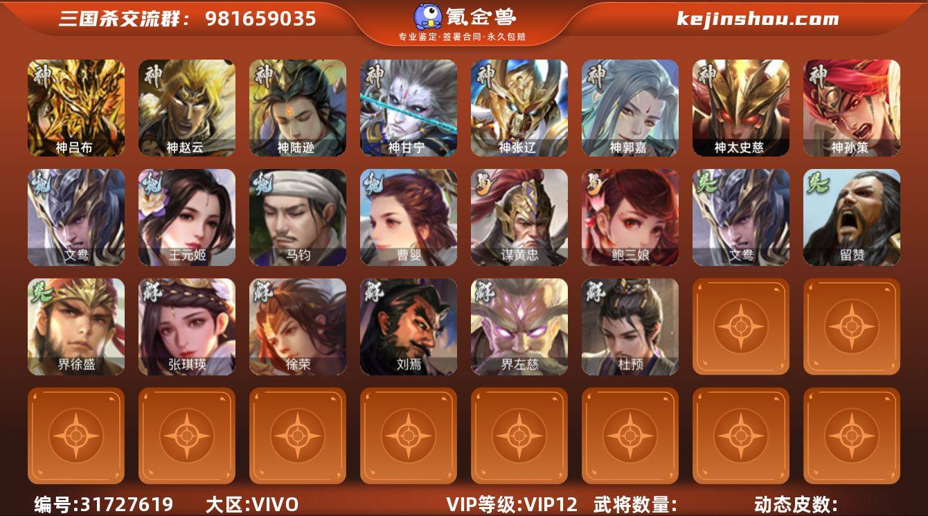 官阶:大将军;VIP等级:VIP11;史诗武将数量:50;动态皮肤数量:47;武将总数:402;史诗宝珠数量:0;将魂数量:549;神将:6;魏国史诗武将:19;蜀国史诗武将:11;吴国史诗武将:7;群史诗武将:15 神赵云,神甘宁,神关羽,神吕蒙,神周瑜,神诸葛亮,SP司马昭,星周不疑,王粲,谋曹操,杨修,文鸯,界钟会,界于禁,界曹真,嵇康,郝昭,陈琳,曹纯,戏志才,关索,马云騄,谋赵云,谋马超,诸葛瞻,张星彩,王平,谯周,界黄忠,花鬘,鲍三娘,谋黄盖,吴景,孙皓,骆统,留赞,界徐盛,贺齐,左慈,张让,星黄忠,陶谦,苏飞,麹义,南华老仙,祢衡,沮授,界左慈,界李儒,杜预,卑弥呼,李傕,许攸,神甘宁-万人辟易(动态),神诸葛亮-风舞魔鸟(动态),神曹操-天下归心,神赵云-战龙在野(动态),SP司马昭-鼠年冬至(动态),钟会-潜蛟觊天(动态),荀彧-驱虎吞狼(动态),邓艾-神兵天降(动态),王粲-笔翰如流(动态),界邓艾-神兵天降(动态),钟会-谋谟之勋(动态),界曹植-鼠年端午(动态),界钟会-谋谟之勋(动态),戏志才-举棋若定(动态),朱灵-以战破氐(动态),花鬘-依心缱绻(动态),费祎-安民护祚(动态),马超-牛年春节(动态),马超-明良千古(动态),黄月英-明良千古(动态),界马超-牛年春节(动态),界黄月英-明良千古(动态),夏侯氏-猪年中秋(动态),关索-鼠年中秋(动态),关索-虎年七夕(动态),鲍三娘-柳娇桃艳(动态),孙策-虎踞江东(动态),孙权-猪年端午(动态),界孙权-猪年端午(动态),孙鲁育-牛年端午(动态),刘赞-灵魂歌王(动态),貂蝉-鼠年七夕(动态),吕布-鼠年七夕(动态),袁绍-一往无前(动态),界吕布-鼠年七夕(动态),界貂蝉-鼠年七夕(动态),界袁绍-一往无前(动态),李儒-鸠杀少帝(动态),界李儒-鸠杀少帝(动态),刘协-龙困于渊(动态)