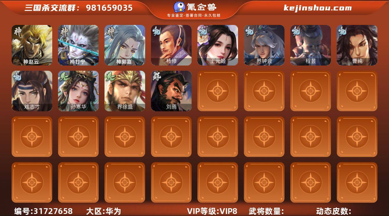 官阶:大将军;VIP等级:VIP10;史诗武将数量:39;动态皮肤数量:55;武将总数:377;史诗宝珠数量:20;将魂数量:1583;神将:4;魏国史诗武将:13;蜀国史诗武将:7;吴国史诗武将:7;群史诗武将:15 神吕布,神赵云,神吕蒙,神周瑜,杨修,王元姬,魏-司马昭,界钟会,界曹真,嵇康,曹婴,曹纯,戏志才,谋夏侯氏,谋马超,张星彩,沙摩柯,谯周,界黄忠,花鬘,周处,孙寒华,骆统,界朱然,界徐盛,界步练师,贺齐,左慈,张让,张琪瑛,星黄忠,麹义,南华老仙,沮授,界左慈,界李儒,公孙康,张绣,李傕,许攸,友徐庶,星董卓,神吕布-监兵噬魅(动态),甄姬-明珠耀躯(动态),SP蔡文姬-兔年冬日(动态),曹婴-兔年春节(动态),朱灵-以战破氐(动态),曹纯-长坂败备(动态),司马昭-昭威淮南(动态),星徐晃-斧引霹雳(动态),花鬘-依心缱绻(动态),关羽-明良千古(动态),诸葛亮-虎年中秋(动态),诸葛亮-明良千古(动态),界诸葛亮-明良千古(动态),夏侯氏-明良千古(动态),关索-虎年七夕(动态),鲍三娘-虎年七夕(动态),李丰-太仓聚粟(动态),胡金定-明良千古(动态),诸葛果-蛇年限定(动态),周处-义除三害(动态),孙寒华-莲华熠熠(动态),孙寒华-威灵尽显(动态),周瑜-免年清明(动态),孙权-牛年七夕(动态),孙尚香-兔年春节(动态),大乔-猪年七夕(动态),界大乔-猪年七夕(动态),界孙权-牛年七夕(动态),徐盛-破军杀将(动态),步练师-牛年七夕(动态),界步练师-牛年七夕(动态),孙鲁育-猪年春节(动态),孙寒华-蛇年限定(动态),左慈-道法显威(动态),刘协-困龙犹斗(动态),貂蝉-鼠年七夕(动态),吕布-鼠年七夕(动态),吕布-傲睨万物(动态),谋刘赪-明良千古(动态),界吕布-鼠年七夕(动态),界貂蝉-鼠年七夕(动态),李儒-鸠杀少帝(动态),界李儒-鸠杀少帝(动态),SP貂蝉-驭魂千机(动态)