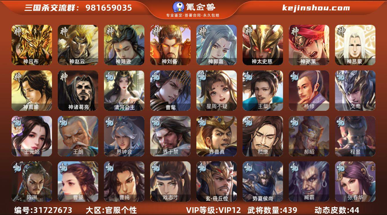 【14789020】官阶:大将军;VIP等级:VIP12;史诗武将数量:69;动态皮肤数量:44;武将总数:439;史诗宝珠数量:0;将魂数量:8074;神将:8;魏国史诗武将:23;蜀国史诗武将:12;吴国史诗武将:11;群史诗武将:24