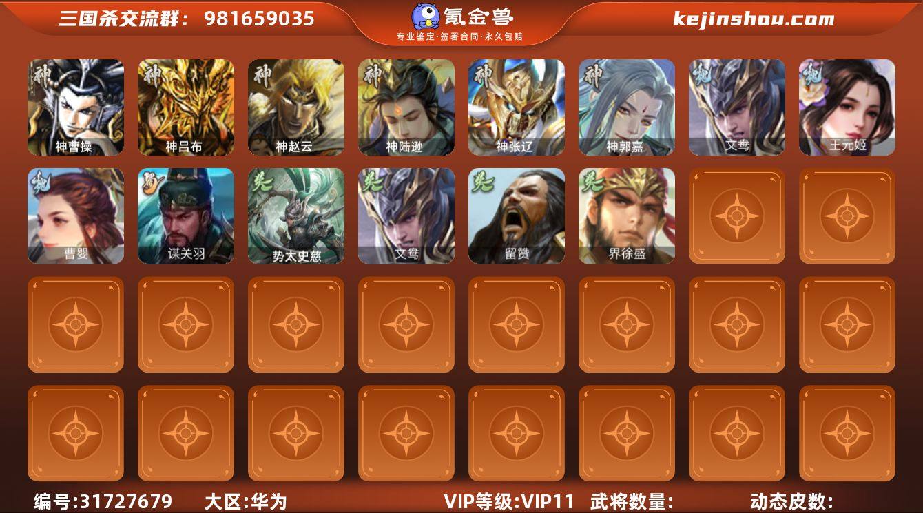 【3160】官阶:大将军;VIP等级:VIP10;史诗武将数量:53;动态皮肤数量:28;武将总数:397;史诗宝珠数量:20;将魂数量:1150;神将:4;魏国史诗武将:17;蜀国史诗武将:9;吴国史诗武将:10;群史诗武将:17 神吕布,神赵云,神孙策,神诸葛亮,谋曹仁,杨修,王元姬,界钟会,界于禁,界曹真,嵇康,郝昭,陈琳,曹婴,曹纯,戏志才,刘晔,蒋干,程昱,谋赵云,谋马超,周群,赵襄,张星彩,王平,沙摩柯,谯周,花鬘,周处,吴景,骆统,留赞,界朱然,界徐盛,界步练师,势太史慈,文鸯,左慈,张让,杨彪,星黄忠,星甘宁,苏飞,麹义,庞德公,南华老仙,祢衡,沮授,界李儒,公孙康,杜预,谋张角,许攸,兀突骨,神吕蒙,神周瑜,SP关羽,SP曹仁,SP蔡文姬,乐进,曹昂,诸葛诞,朱灵,文聘,SP姜维,张春华,钟会,曹冲,郭淮,满宠,界王异,界曹操,界司马懿,界夏侯惇,界张辽,界许褚,界郭嘉,李典,曹真,韩浩史涣,陈群,曹叡,曹休,钟繇,司马朗,王基,李通,郭皇后,孙资刘放,辛宪英,界甄姬,吕虔,鲁芝,蒯越蒯良,界荀彧,界徐晃,杜畿,界曹丕,界邓艾,界曹植,界满宠,界郭淮,卞夫人,界陈群,华歆,袁涣,王双,崔琰,毛玠,谋徐晃,界曹休,牵招,胡班,李昭焦伯,谋郭嘉,牛金,界夏侯渊,臧霸,唐咨,董昭,势陈到,SP孙尚香,关银屏,夏侯霸,马良,关兴张苞,廖化,界马岱,关平,简雍,刘封,界法正,界关兴张苞,界刘备,界关羽,界张飞,界赵云,界马超,SP徐庶,吴懿,周仓,张松,刘谌,夏侯氏,糜竺,马忠,孙乾,李严,黄皓,吴苋,秦宓,界黄月英,界诸葛亮,赵统赵广,严颜,界伊籍,界卧龙诸葛,界庞统,界孟获,界祝融,陈到,吕凯,杨仪,邓芝,傅肜,界简雍,费祎,糜夫人,王甫赵累,界周仓,向宠,宗预,界吴懿,彭羕,界张嶷,谋姜维,谋张飞,诸葛果,界魏延,蒋琬费祎,糜芳傅士仁,甘夫人,势陈祗,鲁肃,孙茹,凌操,大乔小乔,诸葛恪,诸葛瑾,孙鲁育,程普,韩当,潘璋马忠,虞翻,朱然,界周泰,界甘宁,界吕蒙,界黄盖,界周瑜,界大乔,界陆逊,孙鲁班,朱桓,顾雍,孙休,朱治...
