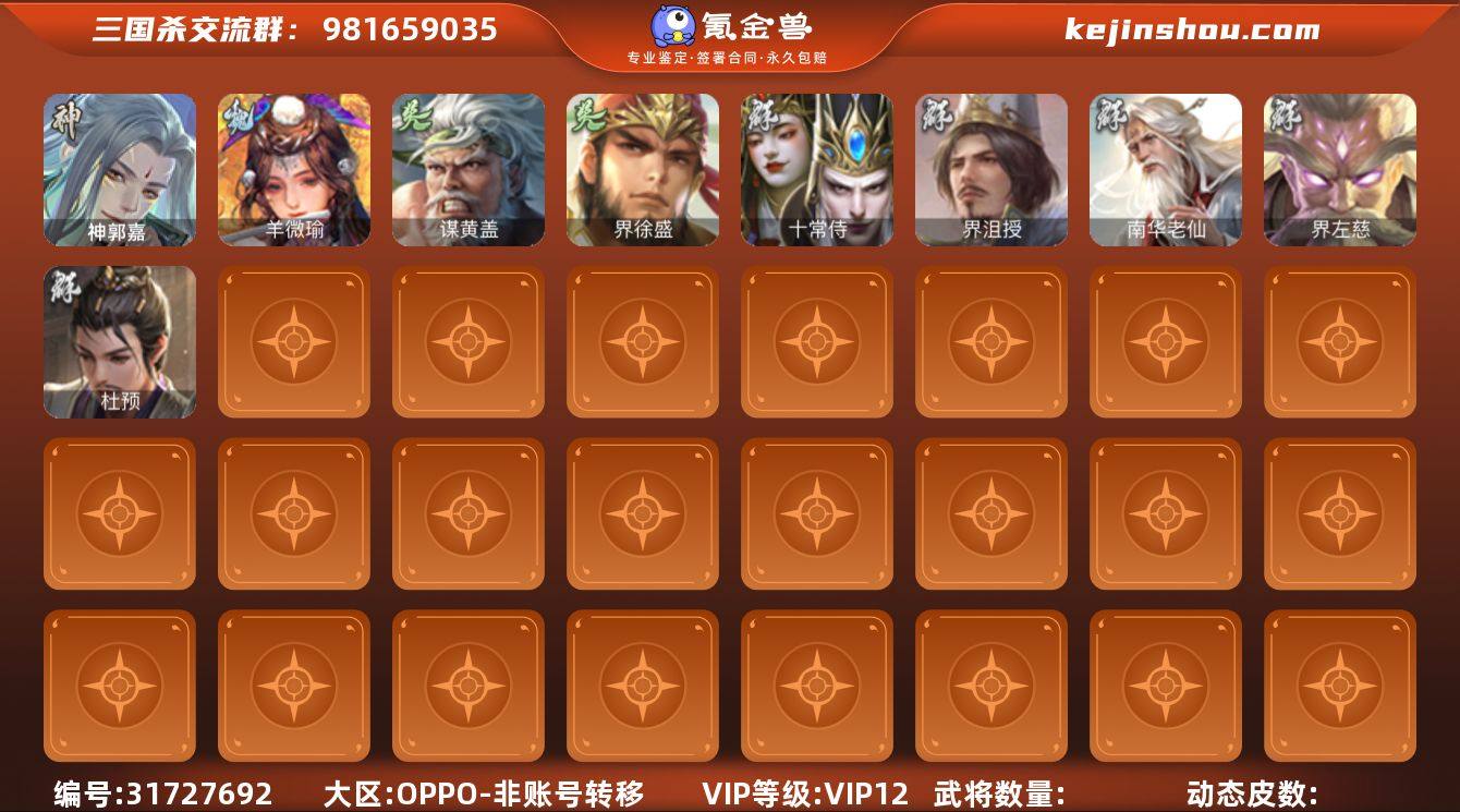 官阶:大将军;VIP等级:VIP12;史诗武将数量:61;动态皮肤数量:44;武将总数:408;史诗宝珠数量:19;将魂数量:4772;神将:8;魏国史诗武将:28;蜀国史诗武将:14;吴国史诗武将:8;群史诗武将:16 神吕布,神赵云,神甘宁,神张辽,神关羽,神吕蒙,神周瑜,神诸葛亮,SP司马昭,星周不疑,王粲,杨修,文鸯,王元姬,司马师,马钧,界钟会,界于禁,界曹真,嵇康,郝昭,陈琳,曹婴,曹纯,戏志才,关索,马云騄,谋赵云,谋马超,诸葛瞻,周群,赵襄,张星彩,王平,沙摩柯,傅佥,界黄忠,花鬘,董允,周处,吴景,骆统,留赞,界朱然,界徐盛,界步练师,贺齐,左慈,星黄忠,星甘宁,陶谦,苏飞,麹义,庞德公,南华老仙,祢衡,界左慈,界李儒,公孙康,杜预,卑弥呼,谋张角,许攸,神甘宁-万人辟易(动态),神吕蒙-兼资文武(动态),神周瑜-陵光引灵(动态),神诸葛亮-观星唤雨,神曹操-天下归心,神吕布-冠绝天下(动态),神赵云-战龙在野(动态),星周不疑-才广志宏(动态),许褚-兔年端午(动态),荀彧-驱虎吞狼(动态),王粲-笔翰如流(动态),张春华-宣穆夜袭(动态),钟会-谋谟之勋(动态),界钟会-谋谟之勋(动态),程昱-泰山捧日(动态),戏志才-举棋若定(动态),曹婴-锋芒毕露(动态),曹纯-长坂败备(动态),王元姬-鼠年冬至(动态),羊徽瑜-牛年中秋(动态),司马师-牛年中秋(动态),关羽-明良千古(动态),马超-牛年春节(动态),张飞-据水断桥(动态),张飞-明良千古(动态),黄忠-明良千古(动态),诸葛瞻-绵竹之殇(动态),界张飞-据水断桥(动态),界马超-牛年春节(动态),夏侯氏-明良千古(动态),SP孙尚香-猪年圣诞(动态),关银屏-兔年春节(动态),赵襄-猪年春节(动态),关索-虎年七夕(动态),鲍三娘-虎年七夕(动态),甘夫人-为君担忧(动态),李丰-太仓聚粟(动态),孙权-永开吴祚(动态),周瑜-兔年七夕(动态),孙权-猪年端午(动态),孙尚香-兔年春节(动态),陆逊-猪年圣诞(动态),孙策-猪年七夕(动态),界陆逊-猪年圣诞(动态),界...