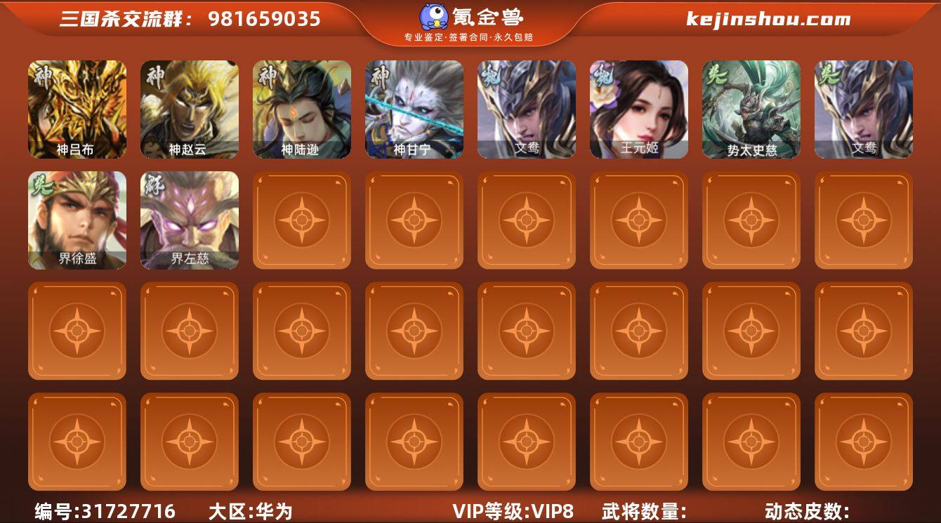 【3064】官阶:骠骑将军;VIP等级:VIP8;史诗武将数量:32;动态皮肤数量:21;武将总数:325;史诗宝珠数量:0;将魂数量:4434;神将:4;魏国史诗武将:10;蜀国史诗武将:3;吴国史诗武将:5;群史诗武将:15 神赵云,神陆逊,神张辽,神诸葛亮,界钟会,界曹真,陈琳,曹婴,曹纯,戏志才,程昱,谋赵云,谯周,谋关羽,周处,骆统,留赞,界徐盛,贺齐,十常侍,张让,星黄忠,星甘宁,麹义,沮授,界左慈,公孙康,谋张角,星董卓,笮融,兀突骨,士燮,司马昭,神吕蒙,神周瑜,SP关羽,SP曹仁,SP蔡文姬,乐进,曹昂,诸葛诞,朱灵,文聘,SP姜维,张春华,钟会,曹冲,郭淮,满宠,界王异,界曹操,界司马懿,界夏侯惇,界张辽,界许褚,界郭嘉,李典,曹真,韩浩史涣,陈群,曹叡,钟繇,司马朗,李通,郭皇后,孙资刘放,吕虔,鲁芝,蒯越蒯良,界荀彧,界徐晃,杜畿,界曹丕,界曹植,界曹彰,界满宠,卞夫人,界陈群,蔡贞姬,崔琰,毛玠,阮慧,谋于禁,牵招,司马伷,谋夏侯渊,界夏侯渊,臧霸,唐咨,势陈到,SP孙尚香,关银屏,夏侯霸,马良,关兴张苞,廖化,界马岱,关平,简雍,刘封,界法正,界关兴张苞,界刘备,界关羽,界张飞,界赵云,SP徐庶,吴懿,周仓,张松,糜竺,马忠,李严,黄皓,界黄月英,界诸葛亮,严颜,界伊籍,张翼,杨仪,邓芝,傅肜,陈震,费祎,糜夫人,向宠,彭羕,谋庞统,谋黄月英,界张嶷,吴班,李遗,霍峻,诸葛果,界魏延,蒋琬费祎,甘夫人,势陈祗,鲁肃,孙茹,凌操,大乔小乔,诸葛恪,诸葛瑾,孙鲁育,程普,韩当,潘璋马忠,虞翻,朱然,界甘宁,界吕蒙,界黄盖,界周瑜,界大乔,界陆逊,孙鲁班,朱桓,顾雍,孙休,朱治,全琮,孙登,界孙权,界孙尚香,SP庞统,严畯,界孙坚,吕岱,周鲂,界孙策,许贡,卫温诸葛直,界韩当,界程普,界虞翻,界潘璋马忠,桥公,陈武董袭,孙翊,界顾雍,界孙鲁班,谋韩当,谋吕蒙,谋周瑜,界全琮,谋小乔,谋诸葛瑾,孟达,友徐庶,友庞统,伏完,界袁术,SP赵云,张宝,伏皇后,李儒,华雄,袁术,界华佗,界吕布,公孙瓒,蔡夫人,公孙渊,郭...