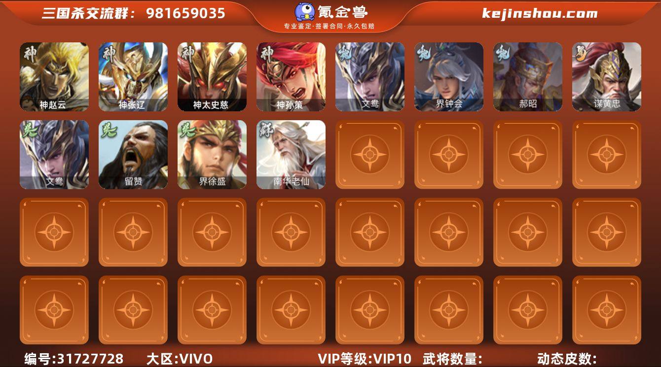 官阶:骠骑将军;VIP等级:VIP8;史诗武将数量:27;动态皮肤数量:16;武将总数:290;史诗宝珠数量:0;将魂数量:0;神将:1;魏国史诗武将:12;蜀国史诗武将:8;吴国史诗武将:6;群史诗武将:8 神赵云,杨修,曹纯,戏志才,刘晔,程昱,谋黄忠,谋赵云,谋马超,诸葛瞻,张星彩,沙摩柯,谯周,花鬘,周处,骆统,界朱然,界徐盛,文鸯,张让,星黄忠,麹义,沮授,界李儒,公孙康,许攸,兀突骨,神吕蒙,神周瑜,SP关羽,SP蔡文姬,乐进,曹昂,诸葛诞,朱灵,文聘,SP姜维,张春华,钟会,曹冲,郭淮,满宠,界王异,界曹操,界司马懿,界夏侯惇,界张辽,界许褚,界郭嘉,李典,曹真,韩浩史涣,陈群,曹叡,曹休,钟繇,司马朗,王基,李通,郭皇后,辛宪英,吕虔,界荀彧,界曹植,界郭淮,辛毗,华歆,崔琰,牵招,胡班,牛金,界夏侯渊,臧霸,唐咨,SP孙尚香,关银屏,夏侯霸,马良,关兴张苞,廖化,界马岱,关平,简雍,刘封,界法正,界关兴张苞,界刘备,界关羽,界张飞,界赵云,界马超,SP徐庶,吴懿,周仓,张松,刘谌,夏侯氏,糜竺,李严,黄皓,界黄月英,界诸葛亮,赵统赵广,界伊籍,界庞统,吕凯,张翼,界廖化,邓芝,傅肜,界简雍,陈震,界周仓,刘巴,彭羕,谋庞统,谋姜维,霍峻,诸葛果,蒋琬费祎,甘夫人,鲁肃,凌操,诸葛恪,诸葛瑾,孙鲁育,程普,韩当,潘璋马忠,虞翻,朱然,界甘宁,界吕蒙,界黄盖,界周瑜,界大乔,界陆逊,孙鲁班,朱桓,顾雍,孙休,朱治,全琮,孙登,界孙权,严畯,吕岱,卫温诸葛直,界潘璋马忠,桥公,张温,陈武董袭,蒋钦,吕范,界顾雍,濮阳兴,界孙休,界全琮,界朱治,界小乔,孟达,友庞统,伏完,界袁术,SP赵云,张宝,伏皇后,李儒,界张角,华雄,袁术,界华佗,界吕布,公孙瓒,蔡夫人,公孙渊,郭图逢纪,张鲁,严白虎,SP黄月英,董白,刘虞,曹节,界貂蝉,SP太史慈,卢植,刘琦,李傕,郭汜,界颜良文丑,张济,张绣,界刘表,星徐晃,星张郃,界公孙瓒,胡车儿,韩遂,界伏皇后,荀谌,马元义,谋刘赪,王濬,张任,李傕郭汜,神郭嘉-虎年清明(动态),神赵云...