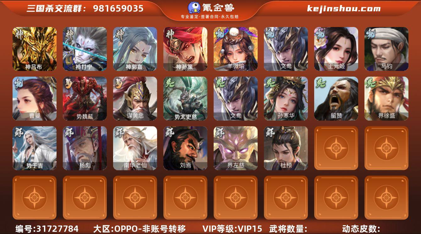 【14789010】渠道11902 一等大将军:动态神郭嘉、动态神甘宁、势魏延、动态刘焉、神孙策、动态文鸯、羊徽瑜、谋黄忠、势太史慈、孙寒华、势于吉、曹婴、马钧、王元姬、界徐盛、留赞、杜预、界左慈、杨彪、南华老仙、神吕布、神赵云、神陆逊、神刘备、神张辽等79史诗。排位武将数量144。精品之光:谋张飞。包裹:豆子11000、手气卡2100、史诗宝珠10、心愿积分7100、将魂22000、金票77000、羽毛15000。 渠道:OPPO、安卓手机均可玩,可以换绑,账号包赔包回收,游戏内玩家互通