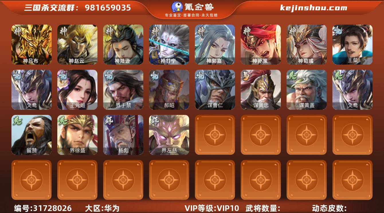 官阶:大将军;VIP等级:VIP10;史诗武将数量:46;动态皮肤数量:35;武将总数:389;史诗宝珠数量:4;将魂数量:14447;神将:4;魏国史诗武将:26;蜀国史诗武将:10;吴国史诗武将:6;群史诗武将:14 神赵云,神张辽,神吕蒙,神周瑜,星周不疑,杨修,文鸯,王凌,魏-司马昭,界钟会,嵇康,郝昭,陈琳,曹婴,曹纯,戏志才,谋夏侯惇,谋曹丕,清河公主,关索,谋夏侯氏,谋赵云,谋马超,诸葛瞻,王平,沙摩柯,谯周,花鬘,董允,周处,孙寒华,骆统,界徐盛,贺齐,势陆郁生,谋公孙瓒,左慈,郑玄,麹义,南华老仙,沮授,界李儒,谋张角,张绣,李傕,阎象,许攸,友诸葛亮,星董卓,郭嘉-以身证道(动态),星周不疑-才广志宏(动态),星周不疑-龙年清明(动态),甄姬-明珠耀躯(动态),曹叡-睥睨天下(动态),SP蔡文姬-兔年冬日(动态),曹昂-竭战麟伤(动态),曹婴-兔年春节(动态),曹纯-长坂败备(动态),司马昭-昭威淮南(动态),张辽-龙生九子(动态),星徐晃-斧引霹雳(动态),清河公主-魅影萦心(动态),刘备-龙御天下(动态),关索-依心缱绻(动态),刘备-明良千古(动态),关羽-明良千古(动态),诸葛瞻-绵竹之殇(动态),界刘备-明良千古(动态),马云騄-牛年春节(动态),卧龙诸葛-火烧博望(动态),周处-义除三害(动态),孙权-永开吴祚(动态),孙策-虎踞江东(动态),孙寒华-莲华熠熠(动态),孙寒华-威灵尽显(动态),孙权-牛年七夕(动态),界孙权-牛年七夕(动态),徐盛-破军杀将(动态),孙寒华-蛇年限定(动态),鲁肃-蛇年端午(动态),文鸯-势若万钧(动态),麹义-扬刀立威(动态),陶谦-安民护祚(动态)