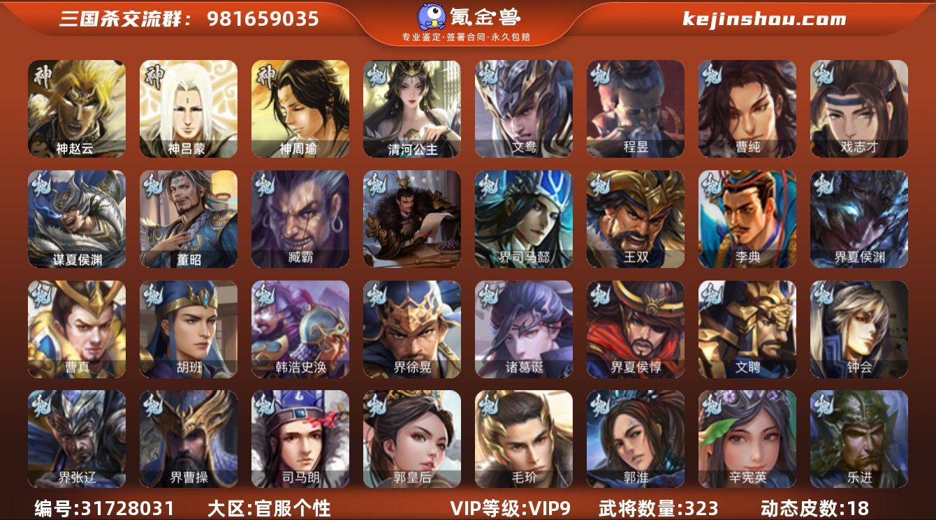 【14788612】官阶:骠骑将军;VIP等级:VIP9;史诗武将数量:31;动态皮肤数量:18;武将总数:323;史诗宝珠数量:11;将魂数量:4038;神将:1;魏国史诗武将:15;蜀国史诗武将:7;吴国史诗武将:6;群史诗武将:15