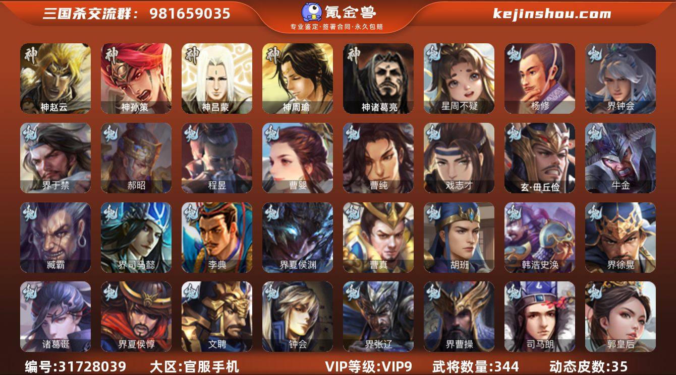 【14788668】官阶:大将军;VIP等级:VIP9;史诗武将数量:32;动态皮肤数量:35;武将总数:344;史诗宝珠数量:21;将魂数量:8601;神将:3;魏国史诗武将:35;蜀国史诗武将:7;吴国史诗武将:3;群史诗武将:12