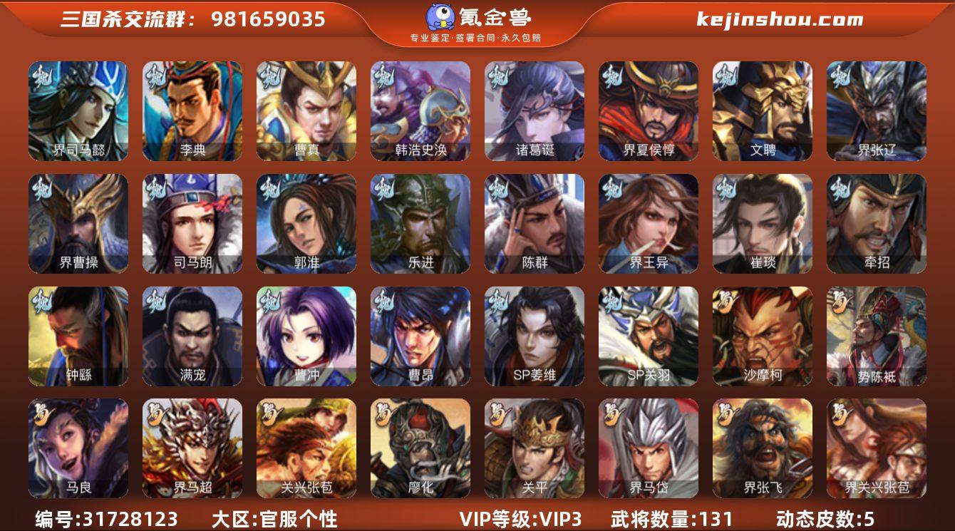 【14788639】官阶:先锋将军;VIP等级:VIP3;史诗武将数量:3;动态皮肤数量:5;武将总数:131;史诗宝珠数量:3;将魂数量:1967;神将:0;魏国史诗武将:2;蜀国史诗武将:1;吴国史诗武将:0;群史诗武将:2 沙摩柯,麹义,友诸葛亮,SP关羽,乐进,曹昂,诸葛诞,文聘,SP姜维,曹冲,郭淮,满宠,界王异,界曹操,界司马懿,界夏侯惇,界张辽,李典,曹真,韩浩史涣,陈群,钟繇,司马朗,崔琰,牵招,SP孙尚香,马良,关兴张苞,廖化,界马岱,关平,刘封,界关兴张苞,界刘备,界张飞,界赵云,界马超,吴懿,周仓,张松,谋黄月英,甘夫人,势陈祗,孙鲁育,程普,韩当,潘璋马忠,虞翻,界甘宁,界黄盖,界周瑜,界大乔,界陆逊,孙鲁班,顾雍,孙邵,陈武董袭,蒋钦,界孙休,界朱治,张布,伏完,刘协,界袁术,伏皇后,李儒,华雄,袁术,界华佗,界吕布,公孙瓒,公孙渊,刘琦,界刘表,谋高顺,曹丕-龙年中秋(动态),黄月英-虎年中秋(动态),陆逊-蛇年清明(动态),小乔-珠玉琳琅(动态),陶谦-安民护祚(动态)