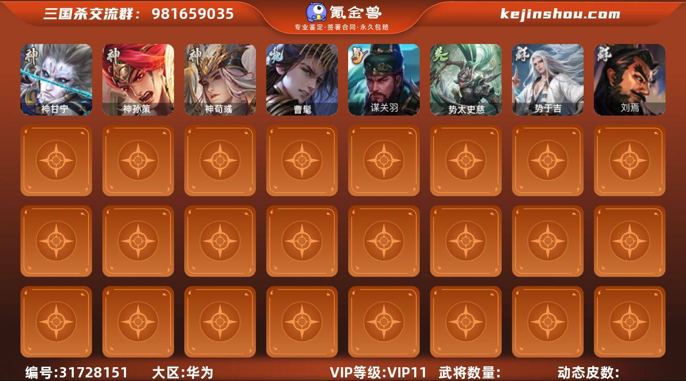 官阶:大将军;VIP等级:VIP11;史诗武将数量:49;动态皮肤数量:49;武将总数:390;史诗宝珠数量:24;将魂数量:3526;神将:9;魏国史诗武将:15;蜀国史诗武将:8;吴国史诗武将:9;群史诗武将:14 神赵云,神刘备,神甘宁,神张辽,神郭嘉,神孙策,神吕蒙,神周瑜,神诸葛亮,星周不疑,杨修,羊徽瑜,界钟会,界于禁,界曹真,嵇康,郝昭,陈琳,曹纯,戏志才,关索,马云騄,谋赵云,谋马超,诸葛瞻,王平,沙摩柯,界黄忠,周处,吴景,孙皓,骆统,留赞,界朱然,界徐盛,界步练师,贺齐,郑玄,张让,星黄忠,陶谦,苏飞,司马徽,南华老仙,界左慈,界李儒,公孙康,杜预,张绣,李傕,许攸,神郭嘉-虎年清明(动态),神甘宁-万人辟易(动态),神诸葛亮-风舞魔鸟(动态),神周瑜-焰腾麒麟(动态),SP蔡文姬-兔年冬日(动态),张郃-背水一战(动态),钟会-谋谟之勋(动态),曹真-虎年春节(动态),界钟会-谋谟之勋(动态),朱灵-以战破氐(动态),王元姬-鼠年冬至(动态),羊徽瑜-牛年中秋(动态),关羽-啸风从龙(动态),关羽-明良千古(动态),马超-牛年春节(动态),黄月英-鼠年春节(动态),诸葛亮-虎年中秋(动态),刘禅-猪年端午(动态),界关羽-啸风从龙(动态),界马超-牛年春节(动态),界黄月英-鼠年春节(动态),界刘禅-猪年端午(动态),关银屏-鼠年中秋(动态),马云騄-牛年春节(动态),张星彩-虎年端午(动态),胡金定-明良千古(动态),周处-义除三害(动态),孙尚香-星流霆击(动态),大乔-鼠年春分(动态),小乔-鼠年春分(动态),界大乔-鼠年春分(动态),界孙尚香-星流霆击(动态),界小乔-鼠年春分(动态),徐盛-破军杀将(动态),孙鲁班-牛年端午(动态),界孙鲁班-牛年端午(动态),孙茹-烟水悠悠(动态),刘赞-灵魂歌王(动态),貂蝉-绝世倾城(动态),吕布-虓虎之勇(动态),左慈-役使鬼神(动态),许攸-盛气凌人(动态),界吕布-虓虎之勇(动态),界貂蝉-绝世倾城(动态),兀突骨-鼠年春节(动态)