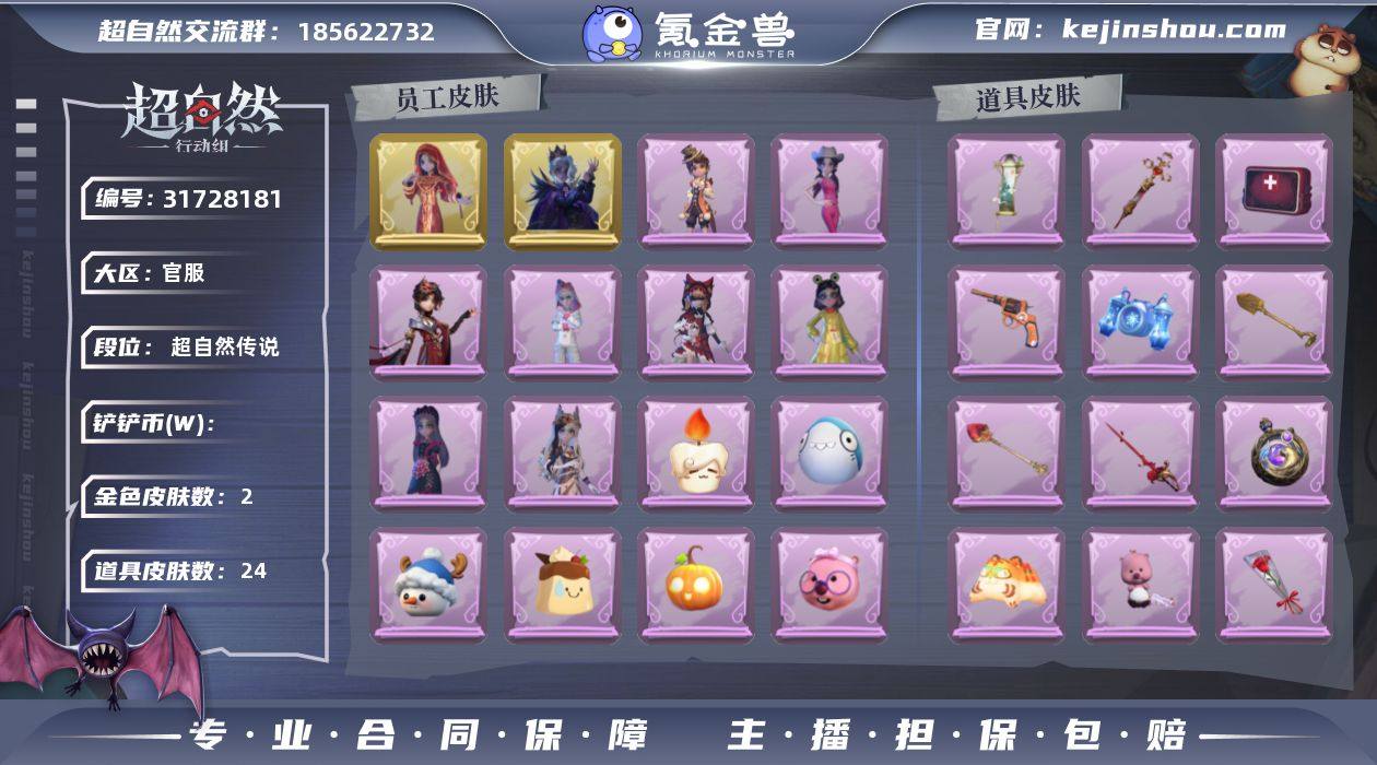【账号核心信息】 - 段位:超自然传说(当前赛季129,历史最高87) - 稀有金皮:渡鸦公爵、镜花辞、厌离绮愿、耀眼的你、仙履奇缘、绒绒对决、莓果陷阱、白光莹 - 限定紫皮:丝绦袅歌、呱呱雨衣、青羽绿、孔雀绿、宝石红、牛仔蓝、素霜白、后室幸存者、铃兰 - 稀有道具:龙鳞、雾器扇、荧光棒-桃心、happy猫、新型时代、飞花令、子夜证词、牛啤背包、梵音莲华、天使的呼唤、蝶恋花 - 载具:绮想花园涂装 - 累计充值:10250元,双特权卡齐全,赛季魔盒等级80级 【出售说明】 - 急出变现,价格可小刀,诚心要的来 - 支持官方验号,资料齐全,无找回风险 - 可提供全部绑定信息,协助换绑,安全无忧 - 段位高、皮肤全,上手即玩,无需额外投入 【价格】 ¥720(可小刀,急出不墨迹)