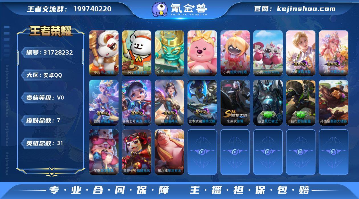 贵族等级:V0 典藏皮肤数:0 珍品无双皮肤数:0 无双皮肤数:0 珍品传说皮肤数:0 传说皮肤数:0 史诗皮肤数:0 皮肤数:7 英雄数:31 段位:铂金 卖家说:王者荣耀新无双皮肤包花可选