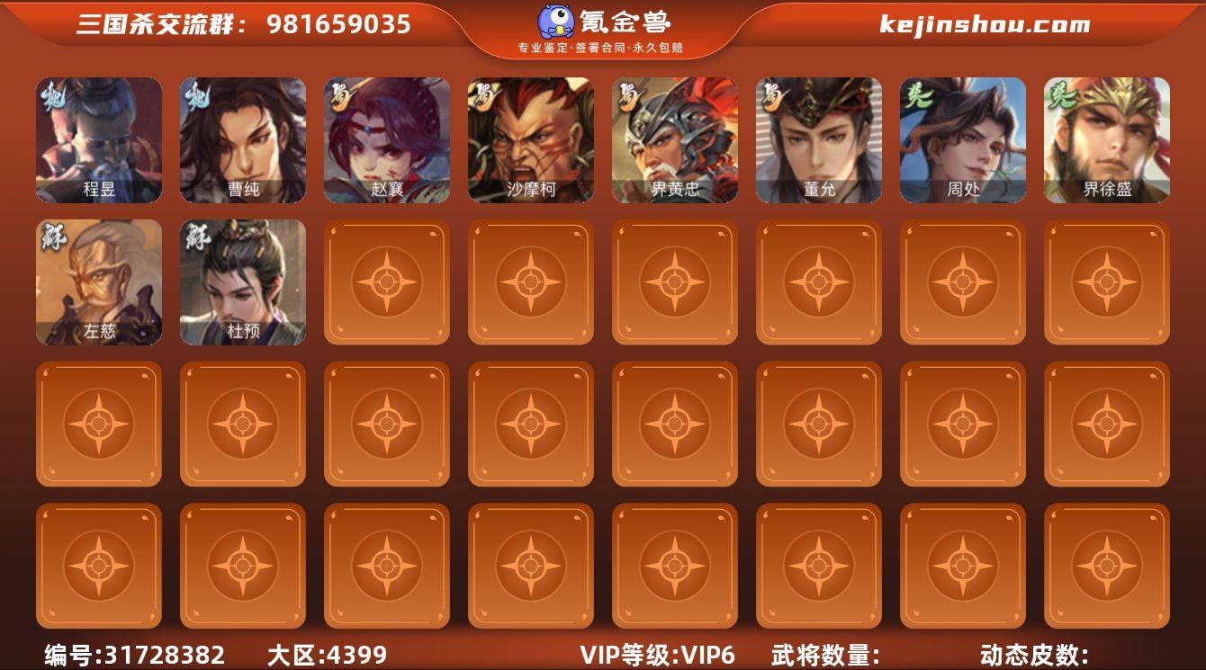 【14789184】渠道12053 骠骑:界徐盛、杜预、程昱、曹纯、界黄忠、董允、赵襄、沙摩柯、周处、左慈、沮授、界李儒、兀突骨等13史诗。排位武将数量89。包裹:豆子12000、史诗宝珠3、将魂3800、羽毛14000。 渠道:4399、安卓手机均可玩,可以换绑,账号包赔包回收 游戏内玩家互通。