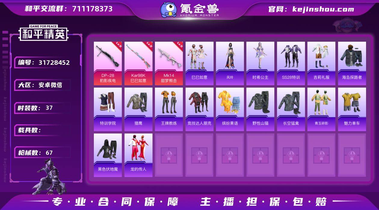 安卓 微信-0粉装-3特效枪-0载具-1粉色飞行器-16328热力值-1王牌印记-37套装-67枪皮 【粉色枪皮等级】:Kar98K-巳巳如意(五级),Mk14-甜梦熊击(五级),DP-28-豹影疾电(五级) 【粉色枪皮】:Kar98K-巳巳如意,Mk14-甜梦熊击,DP-28-豹影疾电 【粉色飞行器】:炫彩糖果飞行器 【粉色降落伞】:炫彩糖果降落伞 【稀有套装】:套装-巳巳如意,套装-炫彩糖果,角色-风玲,角色-时希公主 【稀有枪皮】:AUG-冰晶雪宝,AKM-破晓战魂,AKM-龙的传人,SCAR-L-炫彩节奏,M416-蓝色火焰,AUG-耀粉歌者,M762-天降萌叽,蜜獾-天降萌叽,UZI-啾咪啾咪,UZI-天降萌叽,P90-巳巳如意,VSS-彩虹符号,Mini14-炫彩节奏,S686-生命誓言,S686-巳巳如意,DBS-幻彩电音,DP-28-彩虹符号,破片手榴弹-巳巳如意 【其他套装】:套装-SS28特训,套装-吉莉礼服,套装-海岛探路者,套装-特训学院,套装-猎鹰,套装-王牌教练,套装-竞技达人朋克,套装-缤纷果语,套装-野性山猫,套装-长空猛禽,套装-青玉碎影,套装-魅力单车,套装-黑色伏地魔,套装-龙的传人 【营地ID】:976133484
