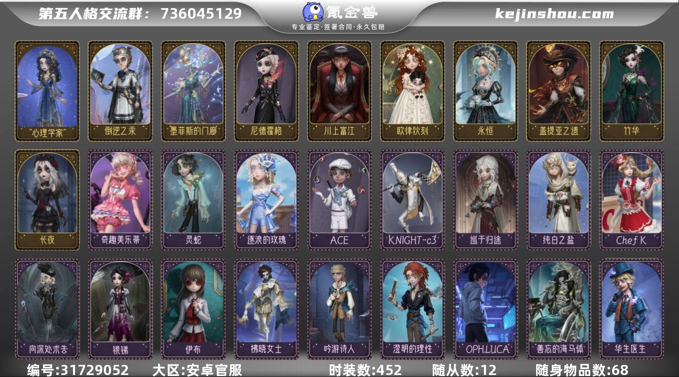 可刀,绑定新邮箱,应急号码未填过,连邮给手机号可换绑,实名网易限制不可更改 心理学家小情号:二限金+长夜,紫皮:除深渊+联动芙莉莲皮无,挂件金紫齐全 囚徒:战队皮+挂件,Rice 记者限定:永恒 女巫:川上富江 律师限定:倒逆之汞 小女孩:欧律狄刻,联动小六+挂件 渔女:肯德基联动皮升级 红夫人:女大公 佣兵:火炮手 杂技演员:ACE 前锋:坂本龙司 舞女:恶之花 金挂:完美人偶 夏 调制架 玫瑰之下 萤之羽 厌离 星辰 唤潮 无尽森林 无限 随从:巴风特(绝版) 归宿:福尔摩斯联动归宿 阅历44、时装数量289(稀世10,奇珍81),随从9(奇珍2),随身物品67(稀世10,奇珍19),角色32