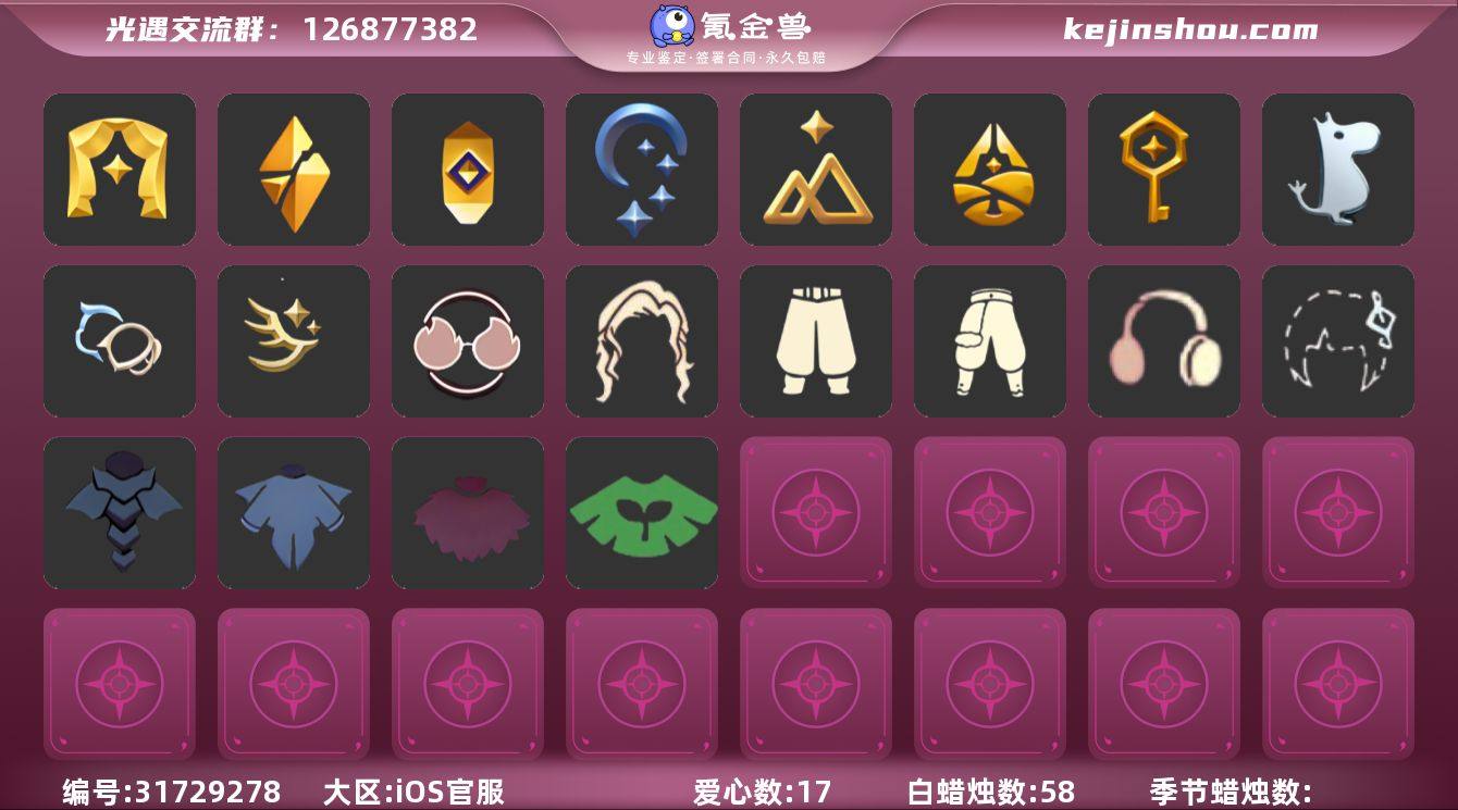 安卓官服 手机账号 4珍稀物品 12毕业季 6毕业图 12蜡烛 【珍稀物品】白枭(帝企鹅发),玫瑰花,透明蝶翼斗,彩虹围巾(五塑彩带斗) 【季节已毕业】小王子季(王子季),潜海季,表演季,欧若拉季(欧若拉),追忆季,夜行季,拾光季,归巢季,九色鹿(九色鹿季),筑巢季,二重奏季,彩染季 【完成地图】晨岛,云野,雨林,霞谷,墓土(暮土),禁阁 【礼包】雪人鞋(圣诞雪人靴),新年裤(瑞气服饰),蝴蝶结(大蝴蝶结),水母(水母肩饰),奔跑发型(奔离远行发),南瓜(冥龙南瓜),巫师(巫师帽),橘子(大橘大利),奥利奥(周年庆抱枕),雪花(雪花发夹),贝壳(贝壳发饰),兔子(玉兔头饰)(玉兔发饰)(兔子发饰),四叶草(四叶草头饰),星月头饰(星月头冠),彩虹耳钉(彩虹耳饰),枯角(巫树犄角),欧若拉之翼,莲花斗(异彩莲花斗篷),福娃(福娃礼包)(春之日礼包)(铜钱斗),蜘蛛斗(蛛丝斗篷)(蛛网斗篷),白绒金(白雪斗篷),红伞(瑞气纸伞),飞鸟纸伞,秋千(情人秋千),小船(情人小船) 【裤子】筑巢季·裤子(设计师长袍),王子服(小王子套装),蓝绿裤(高领舞服),武士裤,背带裤,搓澡巾 【面具】夜行毕业面具(棕熊面具),呼吸面具(潜水面具),黄眉企鹅面具,辉光羚羊面具 【面饰】黑框眼镜(粗框眼镜),青鸟毕业面饰(青鸟面饰),红耳机 【项链】围巾(肩带) 【发型】小王子发型,单侧绑发(单边小辫),飞天盘发(九色鹿丸子头),留辫蘑菇头,虚荣,归巢毕业发型(五塑彩羽发),若笠(箬笠) 【头饰】平顶帽,蓝色音乐会(蓝色音乐符),牛仔帽(西部帽) 【斗篷】燕尾斗篷,领主红斗篷(暗红斗篷),遥鲲斗篷(双翼遥鲲斗),粉红绒毛斗篷(绒毛斗篷),彩染围巾斗篷,绿芽 【配饰】鲲灯(追忆之书),相机(季卡相机),玫瑰花,雨伞,筑巢季·小手办(光之子试衣),高音钢琴(白色高脚钢琴)