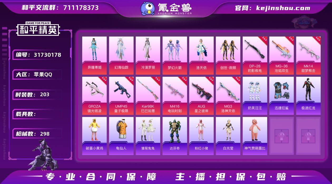 J2410 【性价比小号】5粉 10特 都市 深海小丑鱼 小丑鱼 暗影哥特 浪漫天命 星穹叹咏调 梦幻火箭 金丰海豹 满级枪*10 苹果 手Q-5粉装-10特效枪-0载具-0粉色飞行器-59748热力值-17王牌印记-174套装-209枪皮 【热门品类】:粉装-梦幻火箭,套装-浪漫天命,套装-都市猎人,套装-深海小丑鱼,套装-小丑鱼,套装-奇异狩猎者,套装-金羽特工,套装-龟仙人,套装-暗影哥特,套装-粉红小猪,角色-Mark.06 【粉色套装】:粉装-幻影战神,粉装-梦幻火箭,粉装-绚金战神,粉装-金丰海韵,粉装-星穹咏叹调 【粉色枪皮等级】:SCAR-L-锦绣绵绵(五级),M416-电玩时刻(五级),GROZA-镜光银凌(五级),AUG-暖羊咩咩(五级),M762-青锋波束(五级),UMP45-量子极限(五级),汤姆逊-热量炸弹(五级),Kar98K-巳巳如意(五级),Mk14-甜梦熊击(五级),DP-28-豹影疾电(五级) 【粉色枪皮】:SCAR-L-锦绣绵绵,M416-电玩时刻,GROZA-镜光银凌,AUG-暖羊咩咩,M762-青锋波束,UMP45-量子极限,汤姆逊-热量炸弹,Kar98K-巳巳如意,Mk14-甜梦熊击,DP-28-豹影疾电 【粉色降落伞】:暗夜鎏金降落伞,圣堂之誓降落伞,初号机 觉醒Ver.降落伞,临安公主降落伞,鬼刀降落伞,冷漠罗丽降落伞,炫彩糖果降落伞 【稀有套装】:套装-龟仙人,套装-摩登天骄,套装-绒宝小鹅,套装-巳巳如意,套装-雏菊兔兔,套装-萝兰蝴蝶,角色-狂花道·雅典娜,套装-糖糖葫芦,套装-青团波波,套装-棉花软糖,角色-都市丽猫,角色-许七安,角色-临安公主,角色-怀庆长公主,套装-燕燕于飞,套装-鱼渊荷华,角色-风玲,套装-粉恋花,套装-紫幽梦,套装-蓝冰羽,角色-瑰梦爱神,套装-星渊小夜曲,套装-极速光影,套装-彩虹兔,套装-云朵鹅,套装-雪绒豹,角色-绛羽幽主,套装-朱霞炽焰,套装-凌霄紫焰 【稀有枪皮】:AKM-奇异狩猎者,AKM-影袭,AKM-灼热熔岩,AKM-破晓战魂,AK...