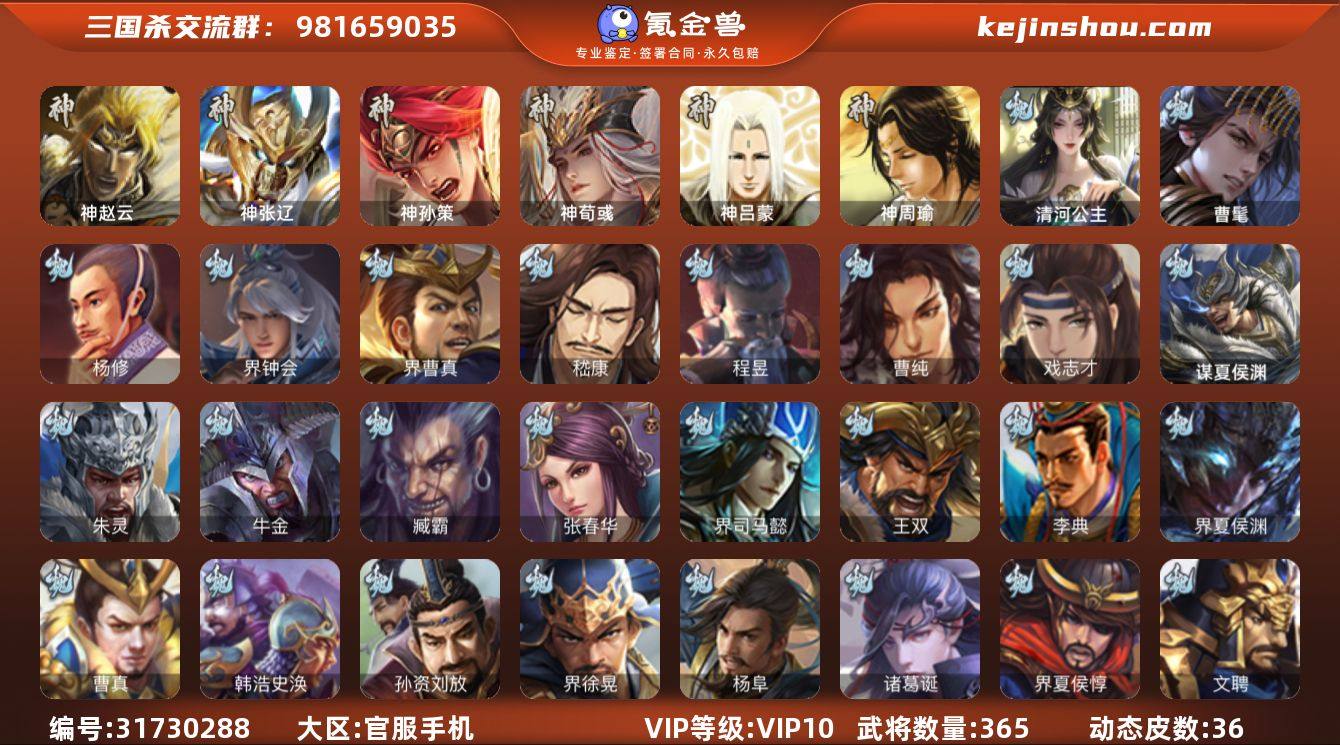 VIP等级: VIP10 官阶: 大将军 武将数量: 365 动态皮肤数量: 36 神将: 神孙策,神荀彧,神张辽,神赵云,神吕蒙,神周瑜 魏国武将: 戏志才,曹纯,程昱,嵇康,界曹真,界钟会,杨修,唐咨-魏,徐庶,张辽,SP蔡文姬,SP曹仁,SP关羽,SP贾诩,SP姜维,SP庞德,卞夫人,蔡贞姬,曹昂,曹操,曹冲,曹洪,曹丕,曹仁,曹叡,王异,张恭,鲁芝,界满宠,曹休,界曹植,满宠,荀攸,王基,钟繇,郭嘉,荀彧,阮慧,杜畿,界郭嘉,崔琰,界曹丕,界荀彧,朱灵,吕虔,界王异,界许褚,界郭淮,华歆,陈群,界邓艾,界典韦,袁涣,李通,乐进,辛宪英,郭淮,毛玠,郭皇后,夏侯惇,曹植,司马朗,谋于禁,界曹操,许褚,界张辽,谋徐晃,张郃,钟会,文聘,曹彰,界夏侯惇,诸葛诞,司马懿,甄姬,杨阜,界徐晃,徐晃,孙资刘放,韩浩史涣,曹真,典韦,界夏侯渊,夏侯渊,李典,于禁,王双,邓艾,界司马懿,张春华,臧霸,牛金,朱灵(国战),曹髦,清河公主,谋夏侯渊 蜀国武将: 董允,关索,界黄忠,沙摩柯,张星彩,诸葛瞻,谋马超,谋黄月英,徐庶,界魏延,杨仪,吕凯,界关羽,界诸葛亮,邓芝,界伊籍,胡金定,严颜,界黄月英,界张嶷,赵云,张松,李丰,界刘备,界刘禅,刘封,糜竺,谋庞统,黄月英,关羽,王甫赵累,吴懿,吴班,祝融,张飞,黄皓,陈震,魏延,界周仓,马忠,界法正,糜夫人,界孟获,刘禅,界赵云,界姜维,张翼,关银屏,界祝融,SP孙尚香,SP徐庶,卧龙诸葛,周仓,简雍,界关兴张苞,诸葛亮,界张飞,界卧龙诸葛,法正,界简雍,赵统赵广,界马岱,关平,马岱,界庞统,庞统,诸葛果,谋张飞,马谡,马超,霍峻,廖化,关兴张苞,孟获,秦宓,吴苋,夏侯氏,姜维,黄忠,刘备,界马超,李严,马良,蒋琬费祎,许靖,刘谌,甘夫人,蜀-糜芳傅士仁,势魏延 吴国武将: 界步练师,界徐盛,留赞,骆统,吴景,潘濬,周泰,全琮,吕蒙,诸葛恪,界孙尚香,界顾雍,大乔小乔,谋周瑜,丁奉,谋吕蒙,界全琮,孙茹,薛综,蒋钦,顾雍,阚泽,孙亮,界朱治,孙休,严畯,界孙权,界孙休,界凌统,祖茂,界吕蒙,陆抗,陈武董袭,孙...