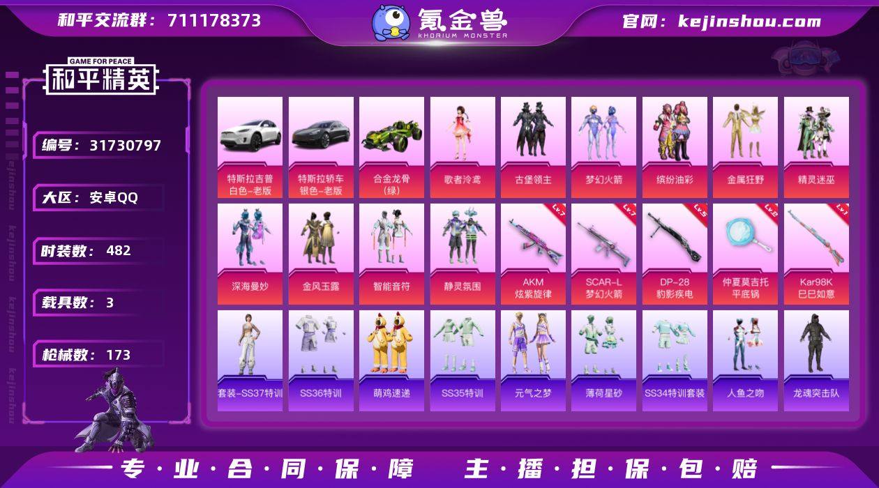 实名:不可二次实名 是否支持人脸包赔:不支持 粉装数量:10 特效枪数量:5 载具数:3 时装数:482 枪械数:173 缤纷油彩,古堡领主,歌者泠鸢,金风玉露,静灵氛围,精灵迷巫,金属狂野,梦幻火箭,深海曼妙,智能音符 七级AKM-炫紫旋律,七级SCAR-L-梦幻火箭,五级DP-28-豹影疾电,二级平底锅-仲夏莫吉托,一级Kar98K-巳巳如意 合金龙骨(绿),特斯拉Model 3(冷光银),特斯拉Model X(珍珠白) SS37特训,SS36特训,炫彩糖果,萌鸡速递,SS35特训,元气之梦,薄荷星砂,SS34特训套装,北国孤狼,冰爽风暴,纯白誓言,乘风破浪,长空猛禽,丛林猎人,潮萌小黄鸭,传奇侦探,炽焰拳师,蝶变,淡雅花蕊,风华少年志,疯狂小兔子,格斗专家,刚毅裁决者,幻彩翩翩,鹤鸣,黑色刀锋,黑色伏地魔,灰色格斗者,红色运动,幻世战舞者,和煦暖阳,酒红色名流,竞技名士,竞技勇士朋克,吉莉礼服,坚韧舞者,精神漫游,街舞达人,空岛之星,科技之星,空投萌叽,龙魂突击队,玲珑飞花,浪漫波比,浪漫天命,蓝色运动,莱茵河畔,妙红点点,麻辣教官,迷域探索者,霓虹极客,霓虹街区,怒火燎原,柠萌假日,牛气满满,PEL摇滚竞梦者,PEL躁动竞梦者,轻风白浪,拳皇97草薙京,奇迹天团,蔷薇魔法师,骑行爱好者,清香五月粽,千禧之恋,瑞龙福将,软萌银虎,燃烧卡路里,热血青春,人鱼之吻,圣诞大吉,圣殿骑士,深蓝冒险家,神秘黑猫,神秘领域,SS11特训,SS14特训,SS17特训,SS18特训,SS19特训,SS20特训,SS21特训,SS22特训,SS23特训,SS26特训,SS27特训,SS29特训,SS31特训套装,SS32特训套装,SS33特训套装,SS6特训,SS7特训,SS8特训,SS9特训,巳巳如意,闪耀星光,甜蜜告白,团圆交子,田园牧歌,特战装甲,五号元素,王牌教练,西部风情,星光纪元,炫光向阳,骁骑迪迦,夏日音浪,雪山精英,星兔领航员,核芯基因,香榭午后,耀粉歌者,摇滚狂鲨,遗落祭司,野性战心,智慧之神,装甲骑士,朱雀圣者,众神之王 炫彩糖果降落伞,炫彩糖果飞行器,歌者泠鸢飞行器,梦幻火箭飞行器,神秘黑猫飞行器,绚金瑰梦飞行器,暗夜鎏金降落伞,春暖花开降落伞,鬼刀降落伞,歌者泠鸢降落伞,海渊国主降落伞,精灵迷巫降落伞,快乐主宰降落伞,蓝莓炮弹降落伞,龙虾霸霸降落伞,梦幻火箭降落伞,PEL轰鸣竞梦者降落伞,深海曼妙降落伞,天启纪元降落伞,香水柠檬降落伞,星夜魔法师降落伞,炫紫旋律降落伞,炙焰牛王降落伞