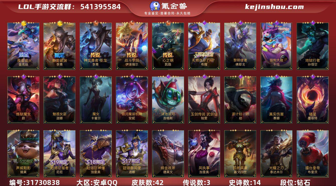 皮肤数:42 典藏皮肤数量:0 神话皮肤数量:2 传说皮肤数量:3 史诗皮肤数量:14 夜星流火 金克丝,乘龙破渊 李青 段位:钻石