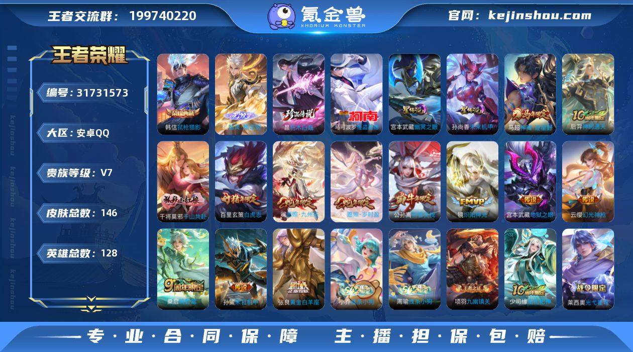 贵族等级:V7 典藏皮肤数:1 珍品无双皮肤数:0 无双皮肤数:1 珍品传说皮肤数:2 传说皮肤数:13 史诗皮肤数:52 皮肤数:146 英雄数:128 段位:荣耀王者 卖家说:有一无双一典藏2珍品传说,13个传说,贵7,146个皮肤,真心卖,还有1个省标几个市标,还可以联系我帮忙打号