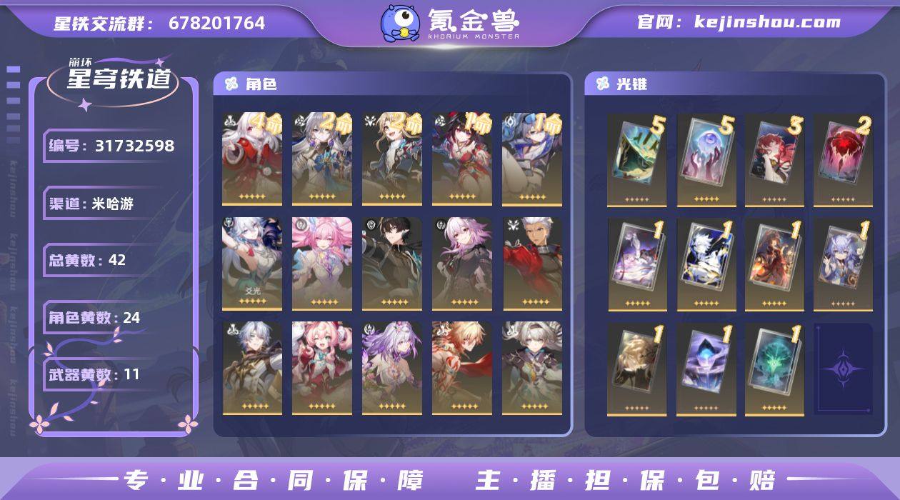 总黄数:42 五星光锥数:11 五星角色数:24 开拓等级:70 开拓者性别:男 星轨专票:0 梦华数量:0 星琼数量:765 4命克拉拉,2命布洛妮娅,2命彦卿,1命花火,1命银狼,0命爻光,0命昔涟,0命丹恒·腾荒,0命长夜月,0命Archer,0命白厄,0命风堇,0命遐蝶,0命万敌,0命流萤,0命知更鸟,0命真理医生,0命阮·梅,0命银枝,0命卡芙卡,0命罗刹,0命希儿,0命姬子,0命杰帕德 5精记忆永不落幕,5精星海巡航,3精银河铁道之夜,2精记一位星神的陨落,1精致长夜的星光,1精黎明恰如此燃烧,1精游戏尘寰,1精时节不居,1精如泥酣眠,1精不息的演算,1精记忆的质料 换绑材料:可提供换绑材料 邮箱状态:未绑定 psn绑定情况:否 taptap绑定情况:否 邮箱实名情况:邮箱未实名 卖家说:完整记忆战舰 有爻光 本人是花火厨