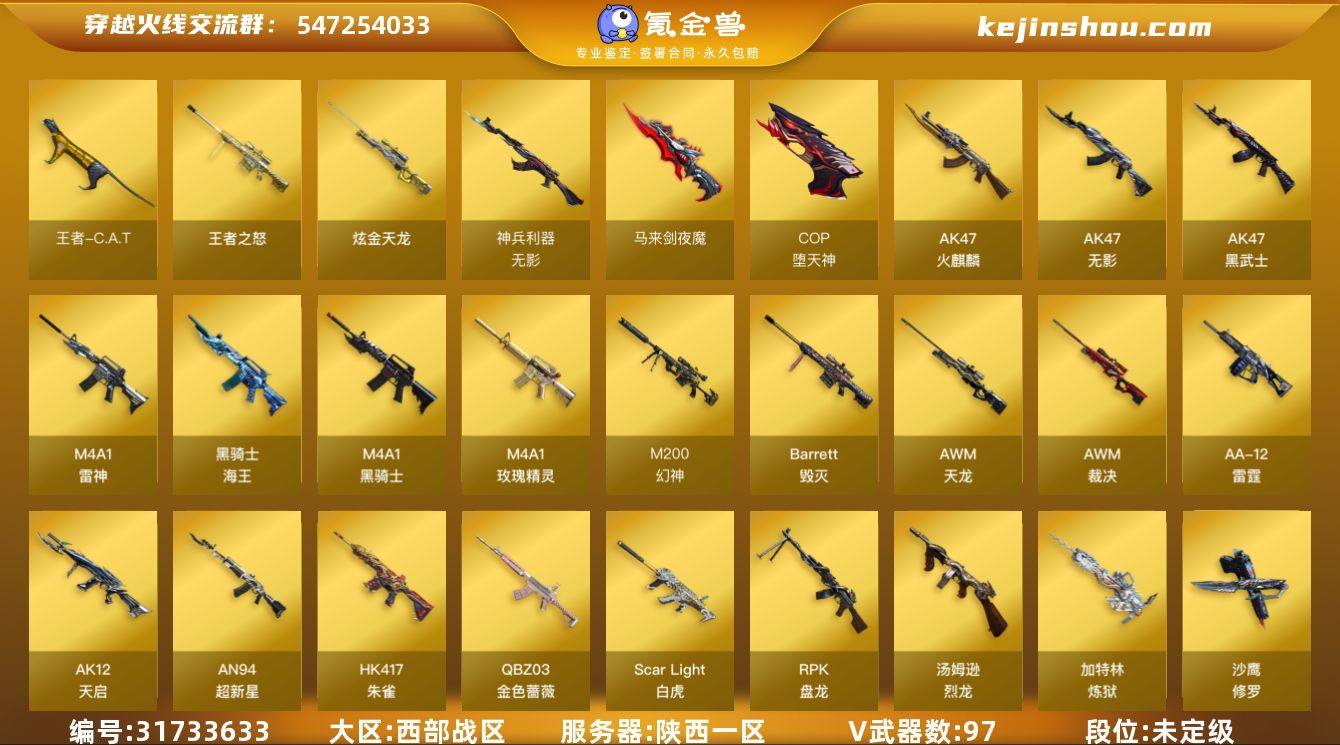 陕西一区-101V-3王者武器数-1炫金武器数 【热门武器】:QBZ03-金色蔷薇,Scar Light-白虎,HK417-朱雀,M200-幻神,M200-竞技荣光,死亡之眼,金色小号,C.A.T,M4A1-黑骑士*4,汤姆逊-烈龙*8,RPK-盘龙*6,加特林-炼狱,斯泰尔-蝴蝶,COP-堕天神,沙鹰-修罗*3 【王者炫金武器】:王者之怒,炫金天龙 【音效卡】:M4A1-黑骑士音效卡,Barrett-毁灭音效卡 【皮肤】:汤姆逊-烈龙-末日皮肤*4,毁灭-暗月,毁灭-CFS2020,毁灭-黑大圣皮肤,毁灭-英雄计划 皮肤,黑骑士-暗月*2,无影-暗月,死神-秘银,战神-粉色甜心皮肤*3,战神-紫绶金章皮肤*8,战神-流金岁月皮肤*3,AWM-天龙-传奇70KG 【角色】:樱,暗夜-X,嘉年华灵狐,娟娟,潜龙队-X,铁骑-乘风破浪,铁骑荣耀,新娜塔莎,影武者-X,职业选手 【人偶武器】:天龙-曼陀罗,火麒麟-灵狐,斯泰尔-蝴蝶,AWM-灵狐-15周年嘉年华,C.A.T,迷你深渊冰龙,迷你牛牛*4,迷你生化手雷,深渊终结者手雷*3,闪光弹-小乔 【暴走生化】:死亡之眼 【挑战大师】:神圣爆裂者III,激光毁灭者III,KAC-圣炎切割者III,神圣爆裂者-末日III*2,阐释者III*2 【英雄级武器】:AK47-火麒麟,M4A1-雷神,M4A1-黑骑士*4,AK47-无影,AK47-黑武士*2,AK12-天启,AN94-超新星,HK417-朱雀,Scar Light-白虎,无影-神兵利器,M4A1-玫瑰精灵,QBZ03-金色蔷薇,AK-47-猩红传说*11,AK47-B-战神,黑骑士-海王,AWM-天龙*2,Barrett-毁灭,AWM-裁决,M200-幻神,M200-竞技荣光,王者之怒-觉醒版,RPK-盘龙*6,加特林-炼狱,汤姆逊-烈龙*8,AA-12-雷霆,沙鹰-修罗*3,沙鹰-天神,COP-堕天神,屠龙*2,龙啸,马来剑-夜魔,擎天*4,麒麟刺,擎天-竞技荣光,斩神刀-雷暴,王者之锋-觉醒版,高爆手雷-雷暴*3,高爆手雷-夜魔,高爆手雷-竞技