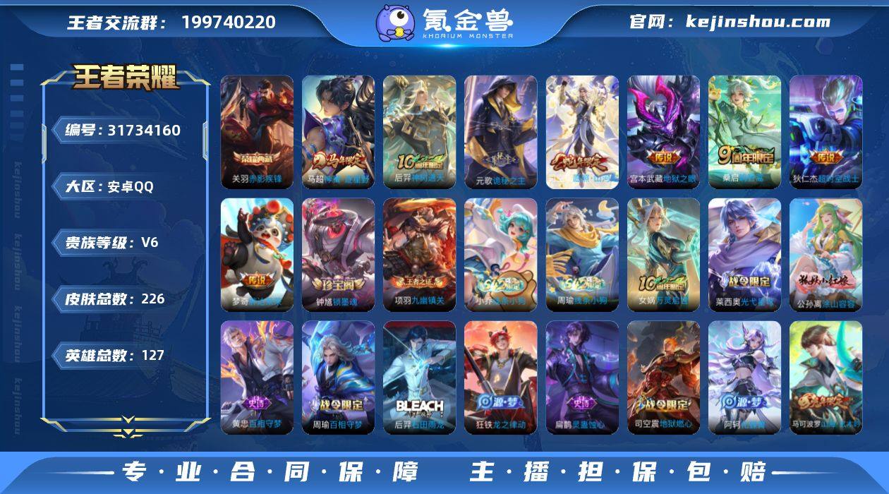 安卓Q-V6-最强王者段位-127英雄-226皮肤-1典藏皮肤-8传说-66史诗 【英雄全皮】:孙权全皮,敖隐全皮,司空震全皮,戈娅全皮,影全皮 【荣耀典藏】:关羽赤影疾锋 【传说皮肤】:马超神骥逐星野,后羿神树通天,元歌诡秘之主,司空震愿照山河定,桑启鸣野蒿,梦奇胖达荣荣,宫本武藏地狱之眼,狄仁杰超时空战士 【限定皮肤】:姜子牙天穹之誓,狄仁杰阴阳师,赵云皇家上将,庄周高山流水,高渐离玩趣恶龙,元歌无心,夏侯惇朔风刀,马可波罗山海玄木吟,狄仁杰魔术师,狄仁杰万华元夜,达摩沙漠行僧,项羽海滩派对,程咬金演武夺筹,兰陵王金庭之子,李元芳云中旅人,钟馗驱傩正仪,雅典娜黎明之约,太乙真人华丽摇滚,鬼谷子五谷丰年,苏烈千军破阵,百里玄策原初追逐者,弈星混沌棋,梦奇顽趣,沈梦溪大漠名商,明世隐疑决卦,裴擒虎李小龙,裴擒虎擒涛扼浪,云中君纤云弄巧,嫦娥拒霜思,西施玲珑珍味,鲁班大师探海日志,桑启海盐诗旅,戈娅驭风魔法,艾琳流音漫舞,司空震地狱燃心,阿古朵江河有灵,张良古海寻踪,蒙犽百解令,蒙恬荣光圣徽,高渐离燃音魔法,妲己灵卜魔法,鬼谷子天穹祈灯,姬小满妄想食味,沈梦溪龙舞盛年,刘邦剑破天穹,周瑜熔金海岸 【年限皮肤】:马可波罗山海玄木吟,司空震愿照山河定 【赛季限定】:夏侯惇朔风刀,弈星混沌棋,明世隐疑决卦,狄仁杰万华元夜,程咬金演武夺筹,钟馗驱傩正仪,苏烈千军破阵,达摩沙漠行僧,兰陵王金庭之子,沈梦溪大漠名商,李元芳云中旅人,桑启海盐诗旅,裴擒虎擒涛扼浪,鲁班大师探海日志,张良古海寻踪,鬼谷子天穹祈灯,刘邦剑破天穹,姜子牙天穹之誓,东皇太一噬灭天穹,太乙真人谧流熔炉,钟馗虚灵犬护,甄姬逆浪荇歌,亚瑟荣光之誓,百里玄策原初追逐者,雅典娜黎明之约,梦奇顽趣,蒙恬荣光圣徽,牛魔星界战将,项羽九幽镇关 【战令限定】:...
