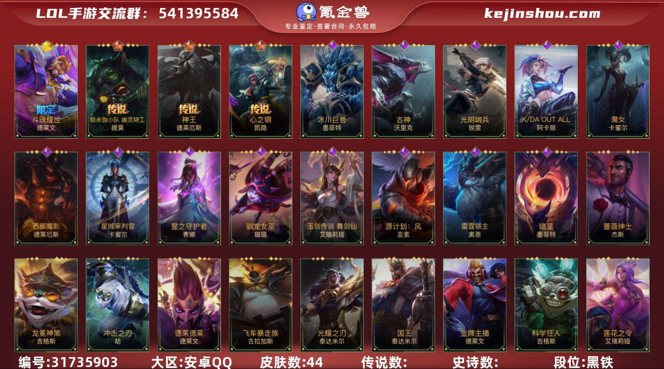 【LSC325】127英雄/135皮肤/华贵铂金/龙的传人/鸡里奥/水晶玫瑰永恩/关羽云长/源计划:净化/黑夜使者亚索/西部魔影卢锡安/福牛守护者女枪/神龙尊者 驭风啸龙/灌篮高手/神王诺手/钢铁军团/战斗学院拉克丝/摄魂猎手凯隐/星域先知(可升级)/猎龙勇士赵信/霸天异形螳螂/暗星螳螂/腥红之月烬/灭迹行者烬/灰烬领主/腥红之月卡牌/电玩女神卡莎/K/DA ALL OUT寡妇/未来战士潘森/铁血女忍/福牛守护者剑姬/战场之王机器人/福牛守护者安妮/源计划:风/战场之王亚索/K/DA ALL OUT阿狸/幻梦甜心阿狸/武神/源计划:雷/娜就去看看/大魔王/驯龙女巫/星之守护者璐璐/秘旅探索者龙女/源计划:裁决/燎原烈焰蔚/太空律动“百万调音”/暗星皇子/福牛守护者皇子/地下拳王/柯基/破败军团女枪/西部魔影诺手/福牛守护者诺手/泳池派对男枪/禁卫机甲/绝命机甲男枪/星之守护者风女/神龙尊者 苍龙/福牛守护者牛头/冰川巨兽石头人/泳池派对炸弹人/电玩勇者(锐雯)/源代码索拉卡/地狱火加里奥/秘旅探索者加里奥/神奇先驱杰斯/猎龙勇士奥拉夫/梦境灵探赛娜/s1光耀之刃/s2光耀之芒/s3光耀之灵/s4光耀之心/s5绯金魅影/s6绯金丽刃/s7绯金战斧/s8绯金鮫灵/s9王牌舰长/s10王牌上将/s11王牌司令/s16冠翎飞行员/S19冠翎征服者/死亡骑士/暗黑武士狮子狗/斗战胜佛/苍穹之光薇恩/时之砂/光耀之心发条/光耀之刃蛮王/光耀之芒金克丝/探戈灵魂崔斯特/王牌舰长/冠翎征服者 尼菈/刀锋女王/绯金魅影(可升级)/钢铁意志/皇家守卫/绯金丽刃(可升级)/小红帽/西部牛仔亚索/偶像歌手/冲击之刃劫/宗师级钓鱼训练师/光明骑士贾克斯/烧烤女神/游击队员/熊猫/光耀之灵/冰霜亚龙/黯黑魔龙龙女/铁拳执事/女警官/双城之战蔚/孤胆英豪/王牌上将皇子/冠翎飞行员 库奇/腥红之月凯南/超级英雄/超武乾坤:电弧/战争血统/制胜金球/创世魔神/西部牛仔女枪/暗影/热血班长/末路教父/无...