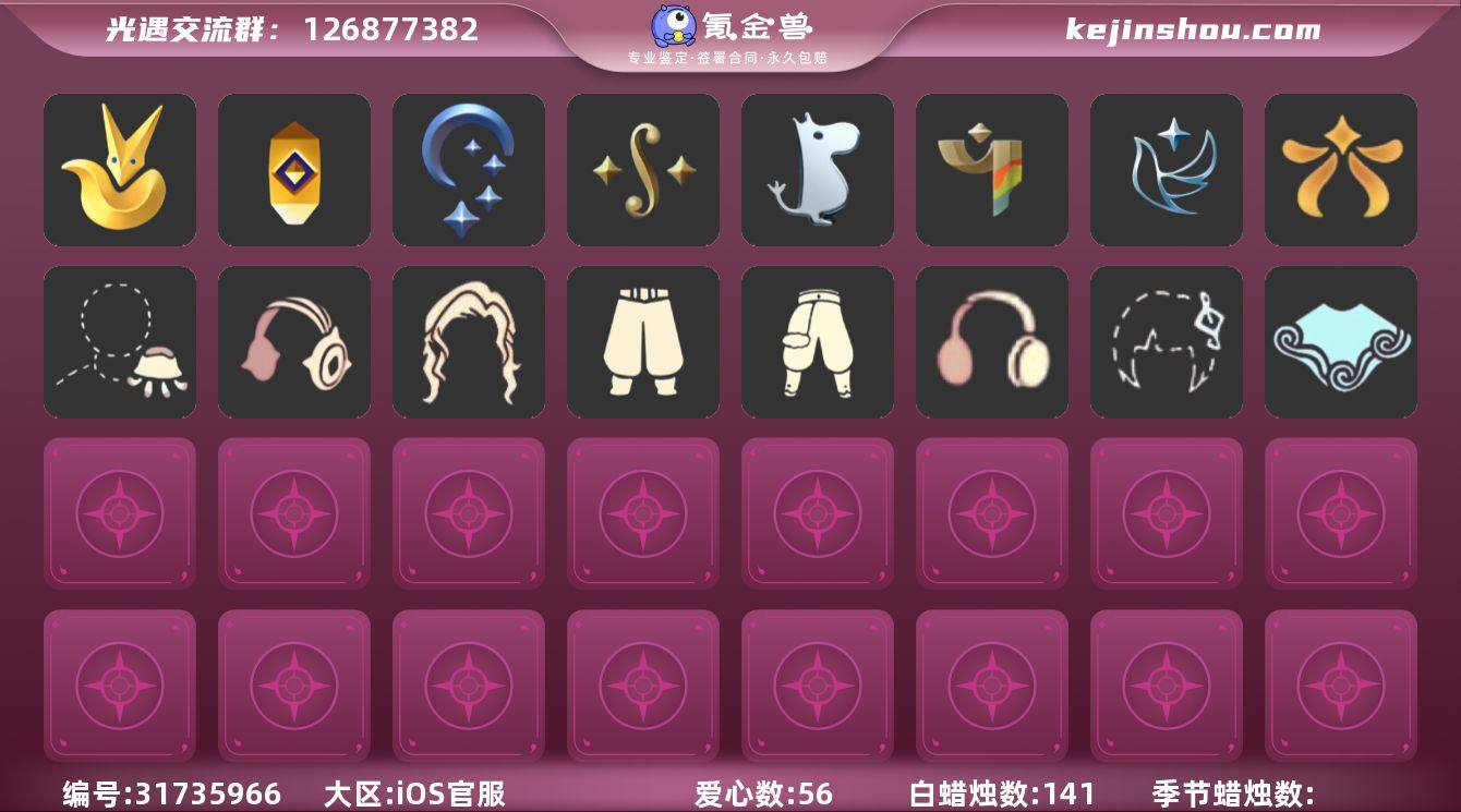 账号类型: 手机账号 季节已毕业: 表演季,破晓季,欧若拉季,夜行季,追忆季,拾光季,归巢季,九色鹿季,筑巢季,二重奏季,姆明季,彩染季,青鸟季 完成地图: 晨岛,云野,雨林,霞谷,暮土,禁阁 珍稀物品: 白枭,透明蝶翼斗,彩虹围巾 礼包: 巫师,围巾,小狐狸,欧若拉之翼,九色鹿角,大铁头,蜘蛛斗,兔子鞋,秋千,白绒金,福娃,人声乐器,奔跑发型,橘子,贝壳,兔子,星月头饰,彩虹耳钉,彩虹耳机,新年裤,四叶草,小提琴,拖鞋,创始人,海蓝波浪发型,满月耳坠,锦标赛桂冠,姆明饰品套装,史力奇套装,史力奇帽子,树精肩饰,小狗周年发饰 裤子: 武士裤,背带裤,搓澡巾,击剑裤,妮妮裙子,蓝绿裤,筑巢季·裤子 面具: 夜行毕业面具,黄眉企鹅面具,辉光羚羊面具 面饰: 红耳机,黑框眼镜,青鸟毕业面饰 项链: 围巾 发型: 归巢毕业发型,若笠,虚荣,留辫蘑菇头,飞天盘发 头饰: 牛仔帽,蓝色音乐会,平顶帽 斗篷: 海洋斗,绿芽,粉红绒毛斗篷,遥鲲斗篷,燕尾斗篷,冥龙斗篷,彩染围巾斗篷,青鸟毕业斗篷 配饰: 雨伞,筑巢季·小手办,高音钢琴,姆明抱枕,小红伞,相机,鲲灯 亮点: 【优质装备】:表演季,白枭(帝企鹅发),武士裤,破晓季,透明蝶翼斗,欧若拉季(欧若拉),归巢毕业发型(五塑彩羽发),筑巢季·小手办(光之子试衣),高音钢琴(白色高脚钢琴),夜行季,追忆季,妮妮裙子(妮妮长裙),牛仔帽(西部帽),姆明抱枕,小红伞(姆明红伞)(姆明大伞),相机(季卡相机),拾光季,彩虹围巾(五塑彩带斗),归巢季,九色鹿(九色鹿季),蓝绿裤(高领舞服),围巾(肩带),筑巢季,二重奏季,姆明季,筑巢季·裤子(设计师长袍),夜行毕业面具(棕熊面具),黄眉企鹅面具,黑框眼镜(粗框眼镜),留辫蘑菇头,粉红绒毛斗篷(绒毛斗篷),遥鲲斗篷(双翼遥鲲斗),燕尾斗篷,冥龙斗篷,鲲灯(追忆之书),辉光羚羊面具,彩染季,飞天盘发(九色鹿丸子头),青鸟季,青鸟毕业面饰(青鸟面饰),青鸟毕业斗篷(青鸟斗篷),欧若拉之翼,福娃(福娃礼包)(春之日礼...
