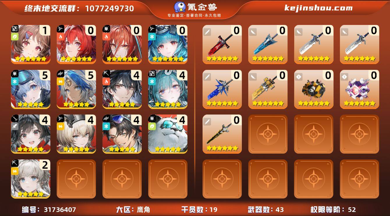 PC明日方舟终末地号,官服50级(现52),01别礼,10艾尔黛拉(签到后11)有01莱万汀,00余烬,可组火队,有6把六星武器,包里两个自选武器箱都还在,基建稳定收入,有月卡和源石配济,金装材料足够,自玩号,可换绑电话号