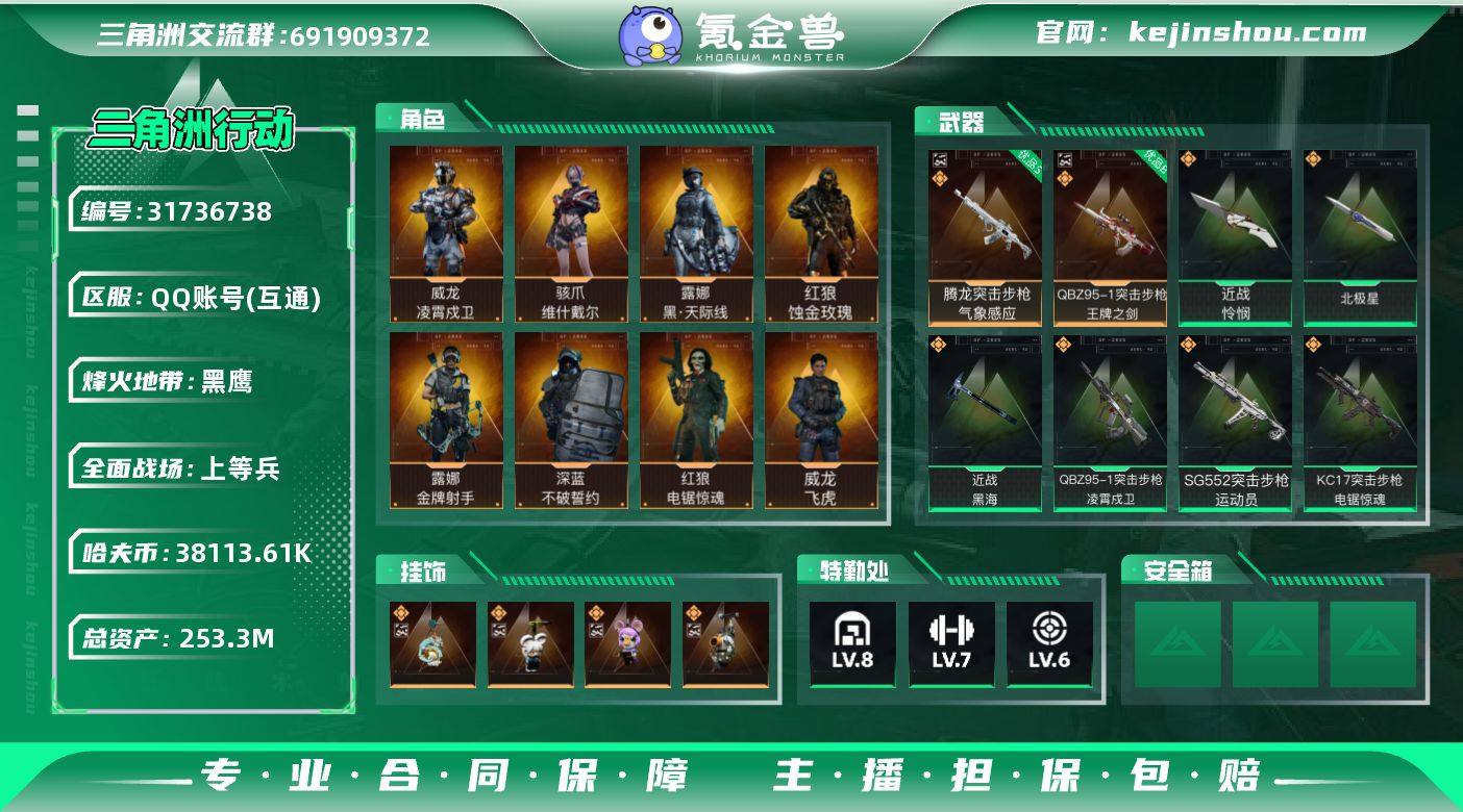 实名:可二次实名 总资产:253.3M 哈夫币:38113.61K 烽火地带段位:黑鹰 烽火地带等级:60 全面战场段位:上等兵 全面战场等级:50 8级仓库,7级训练中心,6级靶场,5级指挥中心,2级潜水中心,3级防具台,3级工作台,3级制药台,3级技术中心,1级收藏室 战术部门等级:3 战斗部门等级:2 医疗部门等级:3 研发部门等级:2 后勤部门等级:2 曼德尔砖-气象感应:0 曼德尔砖-命运王牌:0 曼德尔砖-电玩高手:0 曼德尔砖-美杜莎:0
