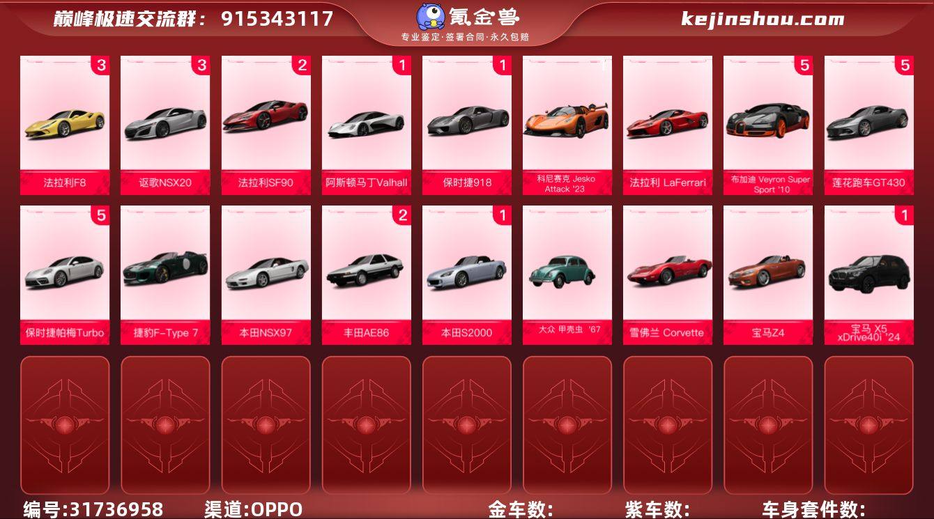 1阶宝马 X5 xDrive40i '24 2阶丰田AE86,1阶本田 S2000 '09,0阶大众 甲壳虫 '67,0阶雪佛兰Corvette C3 `73,0阶宝马Z4 5阶布加迪 Veyron Super Sport '10,5阶莲花跑车GT430,5阶保时捷帕梅Turbo,0阶捷豹F-TYPE,0阶本田NSX97 3阶法拉利F8,3阶讴歌NSX20,2阶法拉利SF90,1阶阿斯顿·马丁Valhalla Concept `19,1阶保时捷918 Spyder `15,0阶科尼赛克 Jesko Attack '23,0阶法拉利LaFerrari `14 卖家说:满阶满改布加迪ss,有些车阶数记不清了,可以搜id去看下
