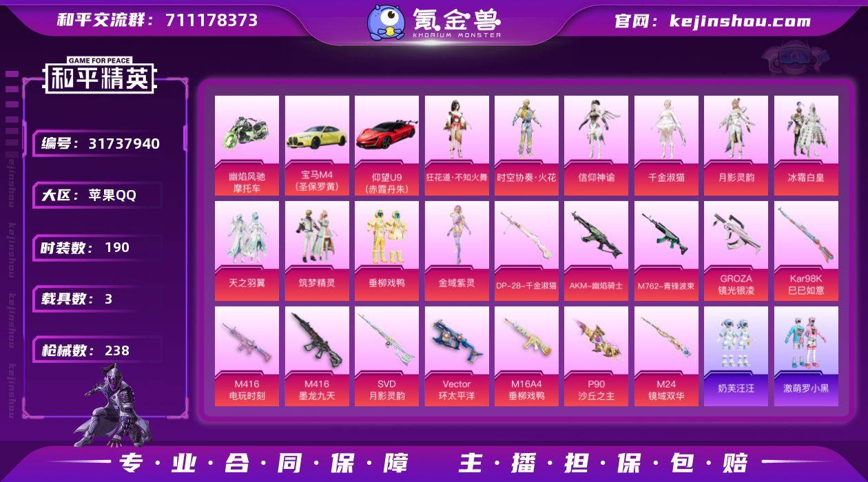 iOS 皇冠号 11印记 墨龙九天敖渊 幽焰骑士维塔 火箭少女 老六服 可改实名 2神装 11粉 12特效枪 3车 190套装 238枪皮 墨龙九天-敖渊3级 幽焰骑士-维塔1级 月影灵韵 信仰神谕 千金淑猫 时空协奏火花 金域紫灵 狂花道不知火舞 梦幻火箭 垂柳戏鸭 冰霜白皇 雪山精英 筑梦精灵 天之羽翼 镭金极速 AKM-幽焰骑士3级 GROZA-镜光银凌满级 Kar98K-已已如意满级 DP-28-千金淑猫4级 M762-青锋波束满级 M416-墨龙九天3级 Vector-环太平洋满级 M16A4-垂柳戏鸭4级 P90-沙丘之主3级 M416-电玩时刻满级 宝马M4圣保罗黄 幽焰风驰摩托车 仰望U9赤霞丹朱 11王牌印记 88162热力值 N7152和平精英买号永久包赔带二次营地ID:738099611 QQSVIP8