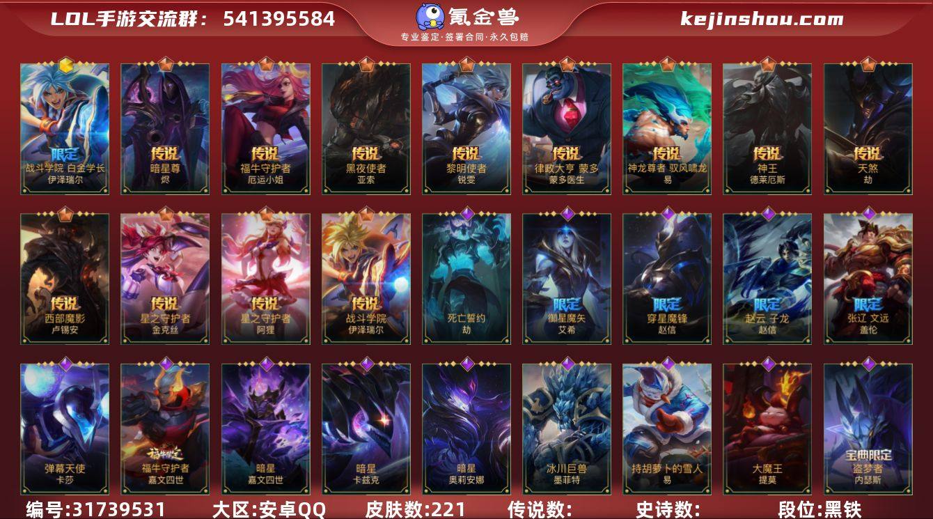 【编号99358】【店长推荐精品号】109英雄-221皮肤 【神话皮肤】:战斗学院 白金学长 伊泽瑞尔 【限定皮肤】:地底世界 崔斯特,广寒仙子 嫦娥 黛安娜,穿星魔锋 赵信,御星魔矢 艾希,赵云 子龙 赵信,张辽 文远 盖伦 【传说皮肤】:星之守护者 金克丝,暗星尊 烬,黑夜使者 亚索,星之守护者 阿狸,天煞 劫,西部魔影 卢锡安,律政大亨 蒙多医生,福牛守护者 厄运小姐,神龙尊者 驭风啸龙 易,神王 德莱厄斯,黎明使者 锐雯,战斗学院 伊泽瑞尔 【史诗皮肤】:钢铁军团 盖伦,张辽 文远 盖伦,星之守护者 拉克丝,战斗学院 拉克丝,殇之机器人 阿木木,雷喵喵尔 雷恩加尔,星域先知 卡尔玛,地狱行者 孙悟空,暗星 奥莉安娜,泳池派对 奥莉安娜,星之守护者 奥莉安娜,腥红之月 黛安娜,焕影迎春 佐伊,赵云 子龙 赵信,猎龙勇士 赵信,穿星魔锋 赵信,猛虎下山 赵信,暗星 卡兹克,清剿小队 金克丝,灭迹行者 烬,圣龙 奥瑞利安·索尔,腥红之月 崔斯特,弹幕天使 卡莎,电玩女神 卡莎,神龙尊者 玉境灵龙 卡莎,魅惑女巫 莫甘娜,NOVA 天赋觉醒 莫甘娜,K/DA ALL OUT 伊芙琳,K/DA ALL OUT 阿卡丽,泳池派对 菲奥娜,福牛守护者 菲奥娜,战场之王 布里茨,源计划:风 亚索,战场之王 亚索,灵魂莲华 亚索,K/DA ALL OUT 阿狸,死亡誓约 劫,灵能特工 凯尔,源计划:山 蕾欧娜,泳池派对 蕾欧娜,战斗学院 蕾欧娜,大魔王 提莫,灵魂莲华 提莫,小蜜蜂 提莫,星之守护者 璐璐,银河魔装机神 希瓦娜,秘旅探索者 希瓦娜,破败军团 希瓦娜,源计划:裁决 蔚,炼狱魔女 蔚,燎原烈焰 蔚,暮星之羽 霞,太空律动 “百万调音” 格温,魔女 卡蜜尔,星域审判官 卡蜜尔,裂帛剪春 卡蜜尔,暗星 嘉文四世,福牛守护者 嘉文四世,泳池派对 李青,地下拳王 李青,电玩上校 库奇,柯基 库奇,奈落之炎 凯南,盗梦者 内瑟斯,星...