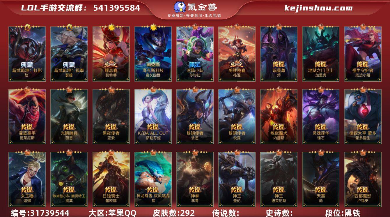 【LOLSYH295】95英雄/292皮肤/荣耀黄金/超武乾坤:虹影/超武乾坤:孤拳/海克斯皇子/乘龙破渊 李青/蝶恋春女警/穿星魔锋/创星之灵/掠星魔刃/御星魔矢/斩星魔剑/赵云子龙/冬季仙境发条/邪恶圣诞老人/涂鸦小队莎弥拉/涂鸦小队金克丝/涂鸦小队艾克/神王盖伦/心之钢凯隐/源计划:净化/光明哨兵薇恩/星之守护者金克丝/暗星尊/星域游侠卡牌/K/DA ALLOUT萨勒芬妮/黑夜使者亚索/斗魂无双亚索/星之守护者阿狸/天煞劫/西部魔影卢锡安/日蚀骑士蕾欧娜/月蚀骑士蕾欧娜/驯龙炮手/欧米伽小队 幽灵特工/星之守护者 落/星之守护者 陨/剪胜裁春格温/神拳盲僧/律政大亨/炼狱魔犬/福牛守护者女枪/黎明使者永恩/神龙尊者 驭风啸龙/灌篮高手/神王诺手/女主播风女/源计划:联合/西部天使寒冰/黎明使者锐雯/战斗学院ez/地狱之门卫士/西部天使赛娜/灵魂莲华锤石/钢铁军团/霸天剑魔亚托克斯/睡衣守护者拉克丝/惊悚派对/殇之机器人/地狱火阿木木/霸天战士狮子狗/雷喵喵尔/丧尸努努/地狱行者猴子/腥红之月皎月/无限烈焰/烈焰仙子皎月/焕影迎春佐伊/恶魔之刃/赵云 子龙/猎龙勇士赵信/猛虎下山/霸天异形螳螂/暗星螳螂/清剿小队金克丝/猛虎布隆/圣诞老人/源计划:升华/腥红之月烬/灭迹行者烬/霸天龙神龙王/未来战士卡牌/弹幕天使/K/DA ALL OUT卡莎/神龙尊者 玉境灵龙/斗魂无双尼菈/K/DA ALL OUT寡妇/猎龙勇士潘森/铁血女忍/源计划:暗影/源计划:火/玉剑传说 无双/福牛守护者剑姬/战场之王机器人/悦鼓春生萨勒芬妮/银河魔装机神安妮/福牛守护者安妮/源计划:风/灵魂莲华亚索/电玩女神阿狸/死亡誓约劫/玉剑传说 无劫/武神/灵能特工天使/欧米伽小队 魔鬼伞兵/小恶魔/虎头虎脑/大魔王/灵魂莲华提莫/小蜜蜂提莫/招财进宝/驯龙女巫/寒冬精灵/银河魔装机神龙女/破败军团龙女/炼狱魔女/暮星之羽/魔女青钢影/星域审判官/裂帛剪春青钢影/福牛守护者皇子/水...